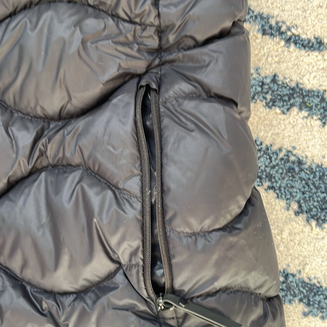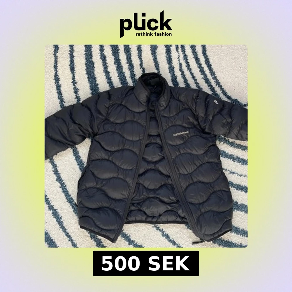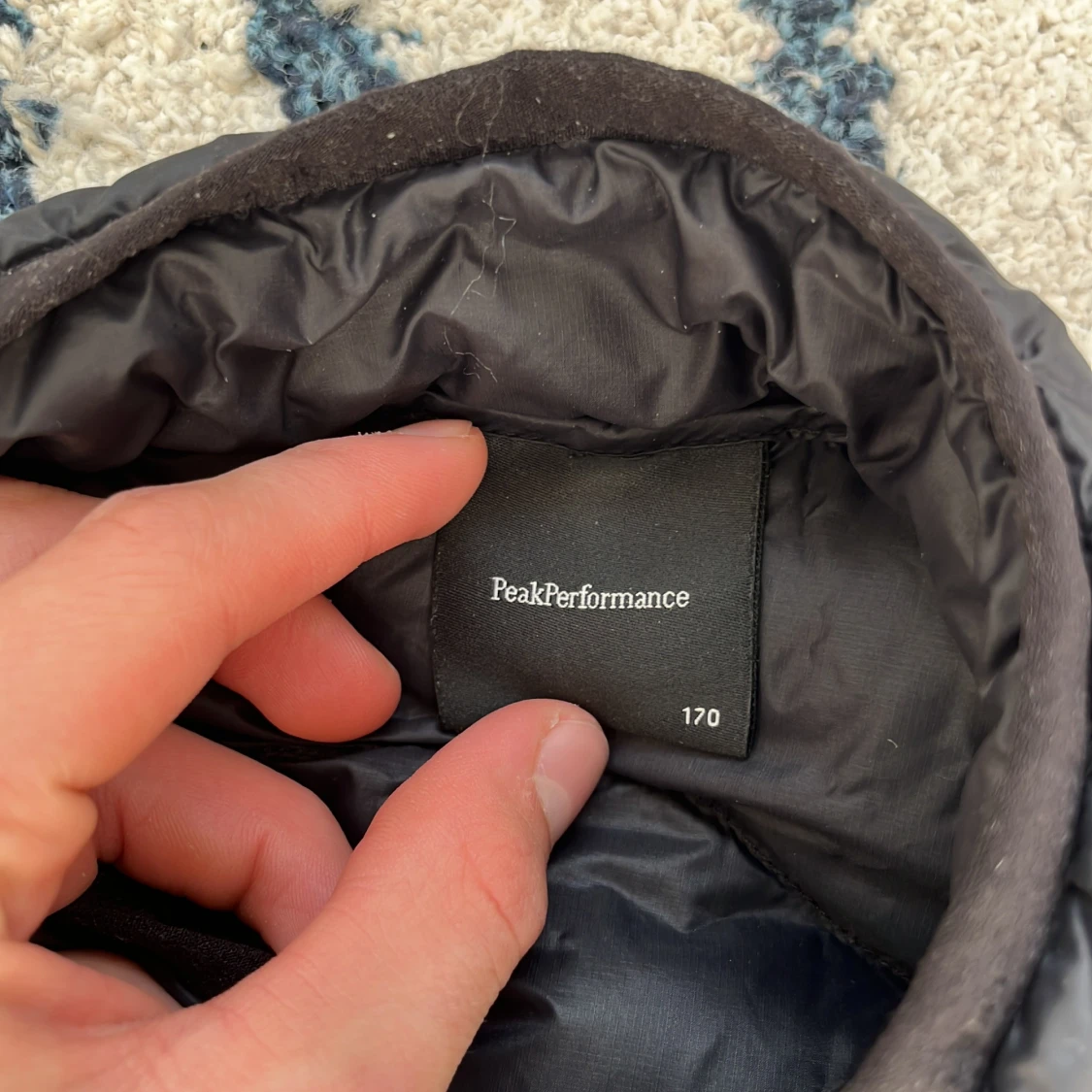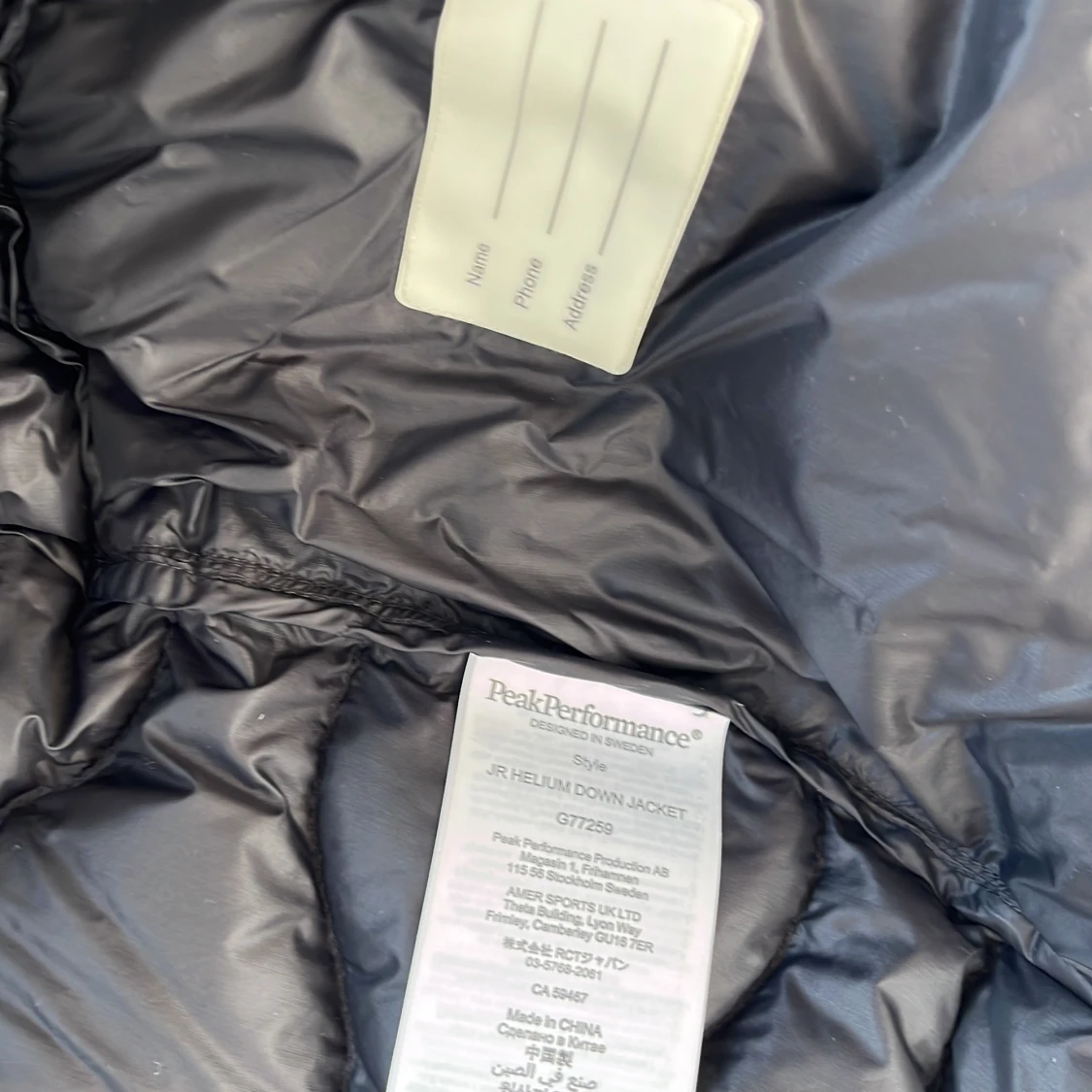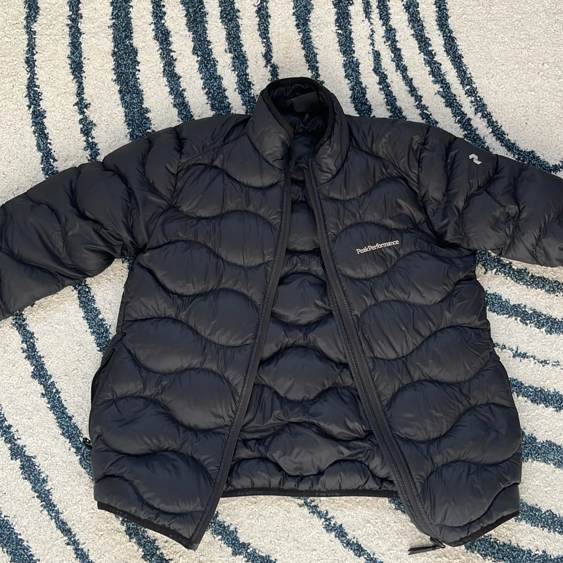 Svart dunjacka från Peak Performance i modellen Helium. Jackan har vågformat quiltat mönster, dragkedja framtill och hög krage. Lätt och smidig med diskret logga på bröstet. Perfekt för kyliga dagar när du vill hålla stilen. Storlek 170