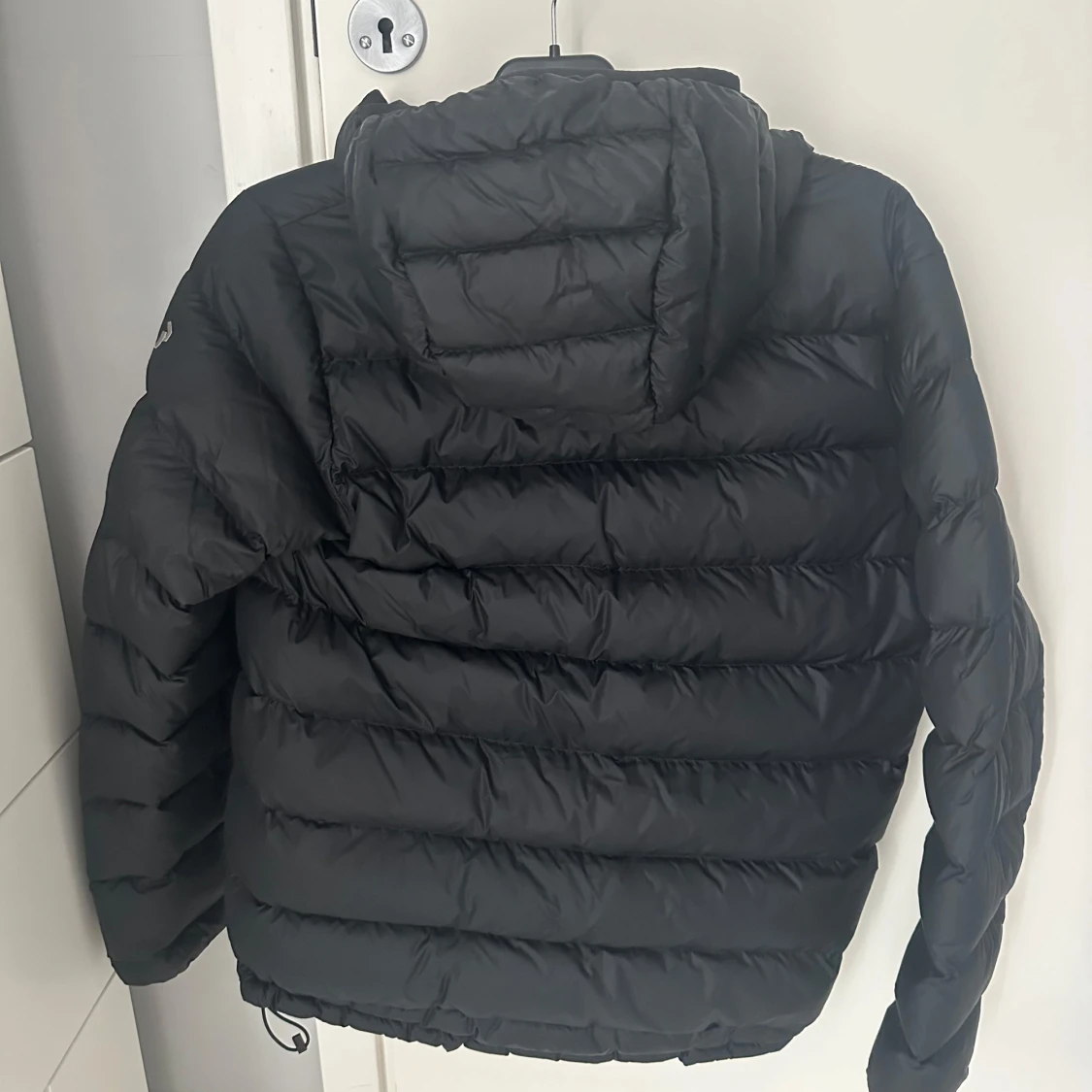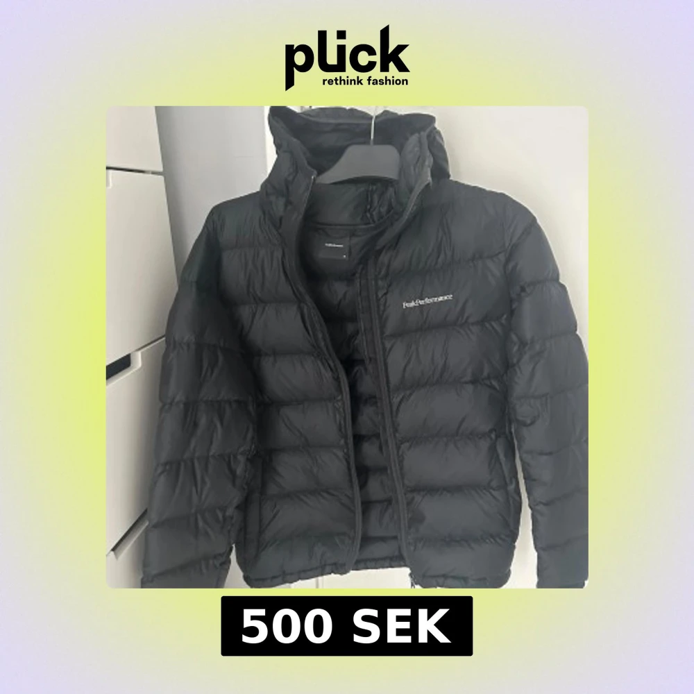 Säljer en svart dunjacka från Peak Performance med huva och dragkedja. Jackan är quiltad och har en stilren look med logga på bröstet. Perfekt för kalla dagar och enkel att matcha med allt. Snygg och funktionell för vintern!