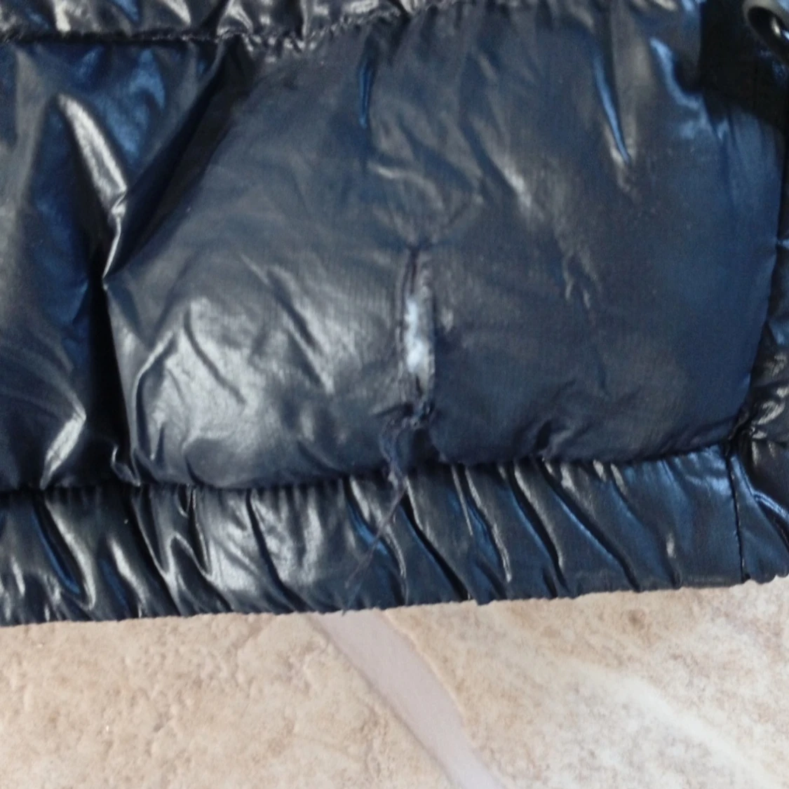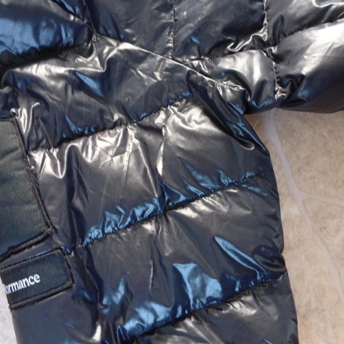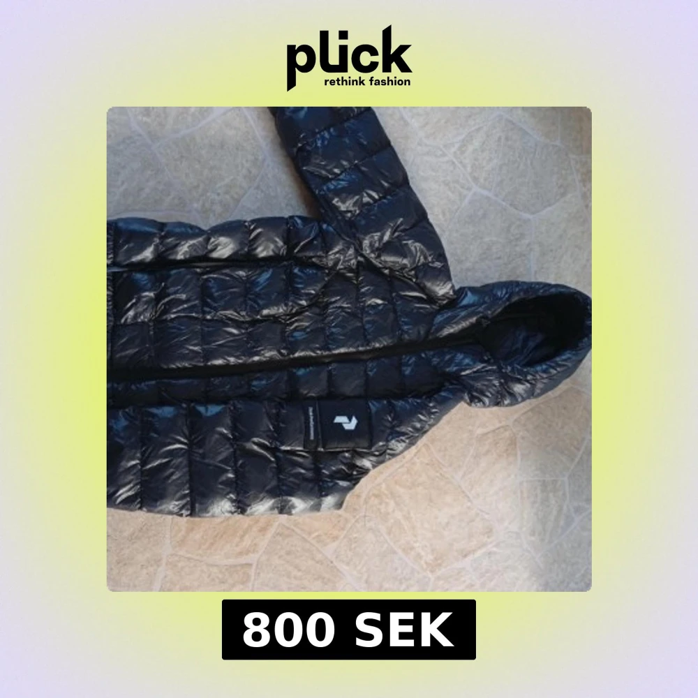 Säljer en svart, glansig dunjacka från Peak Performance med huva och klassisk quiltad design. Jackan har en stor logotyp på ärmen och dragkedja framtill. Perfekt för kalla dagar när du vill hålla stilen och värmen. Två små hål som borde gå att sy.