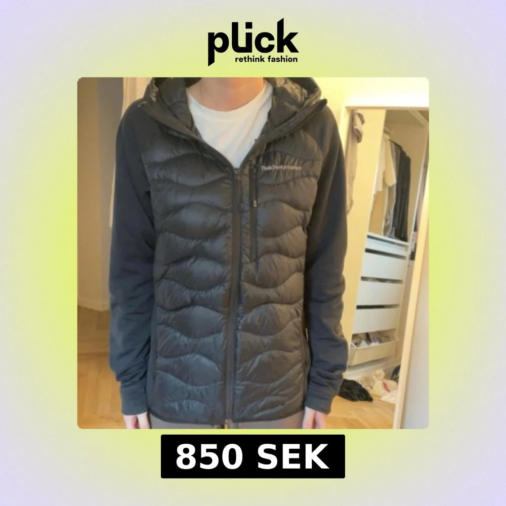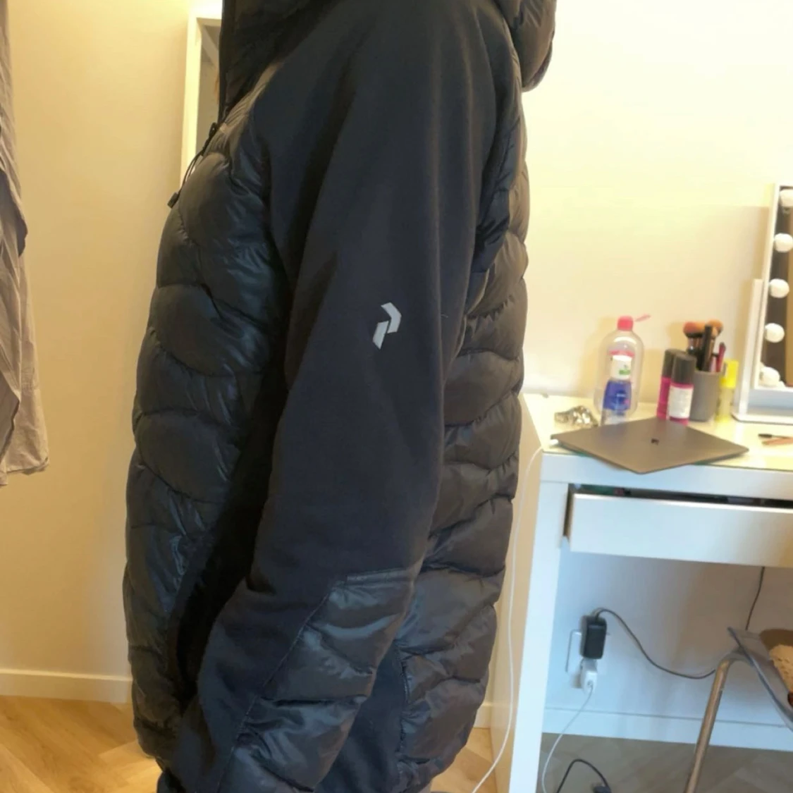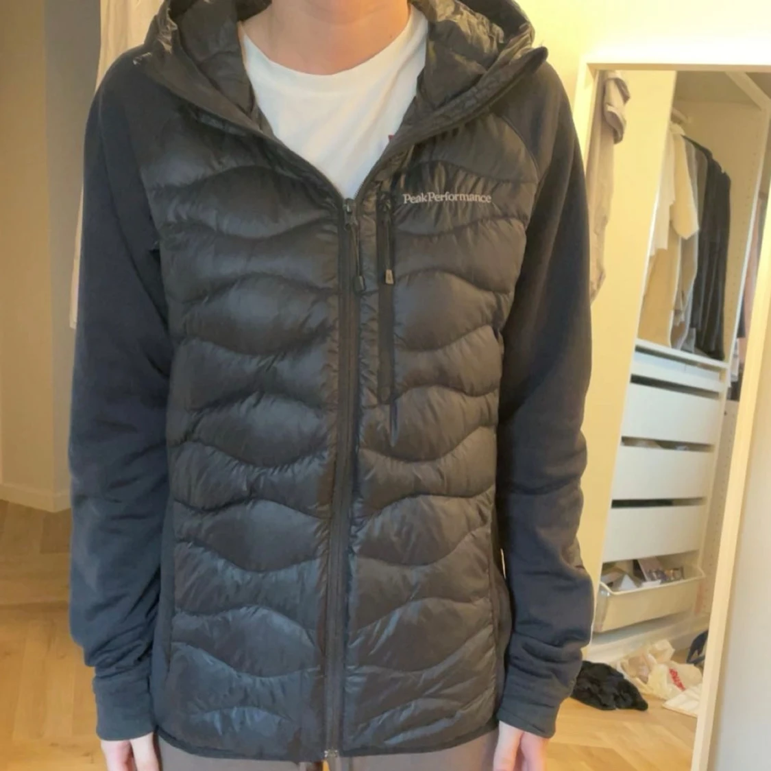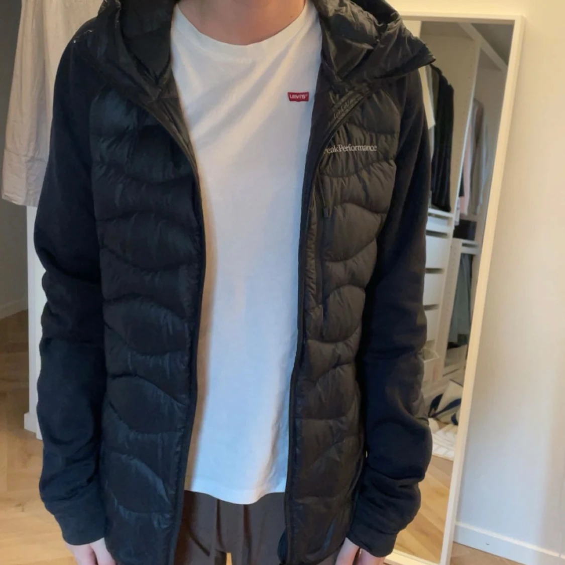 Svart dunjacka från Peak Performance med huva och dragkedja. Jackan har quiltad framsida och släta ärmar, samt diskret logga på bröstet och ärmen. Perfekt för kyliga dagar och har en clean, sportig look.