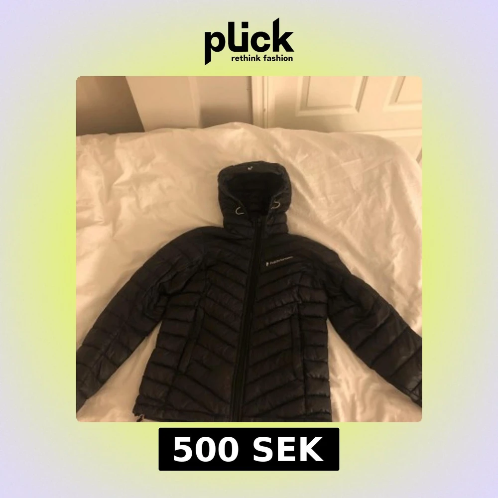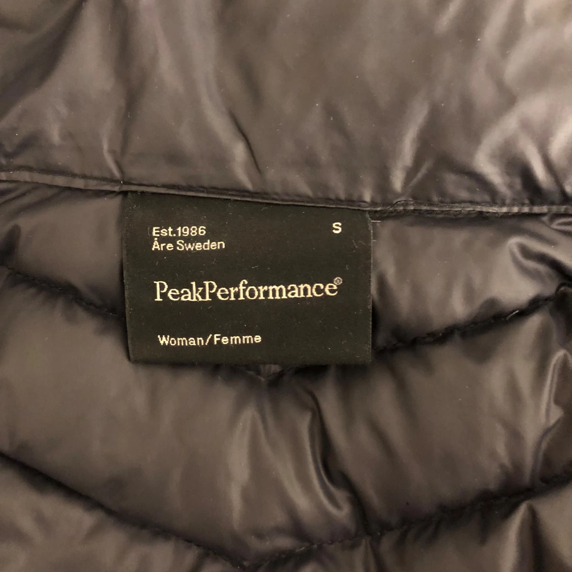 Svart dunjacka från Peak Performance i svart. Den är använd ett fåtal gånger och har 4 stycken små hål🤍