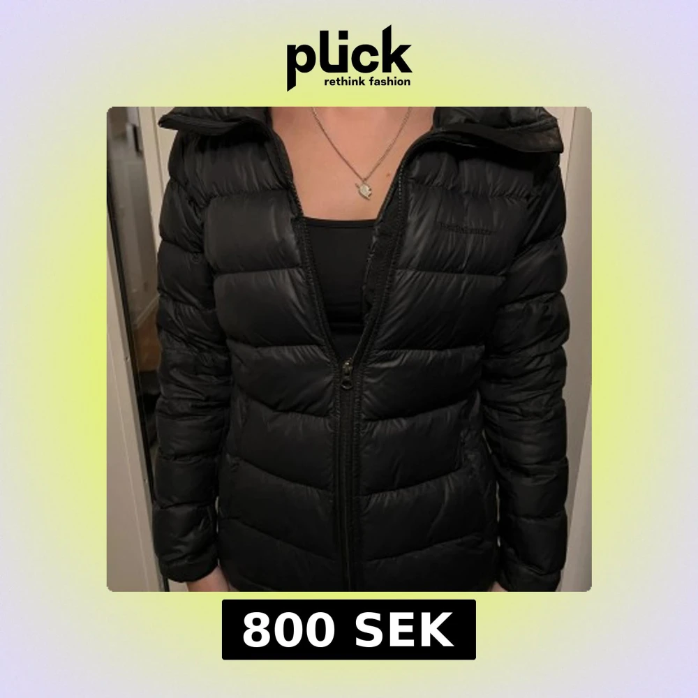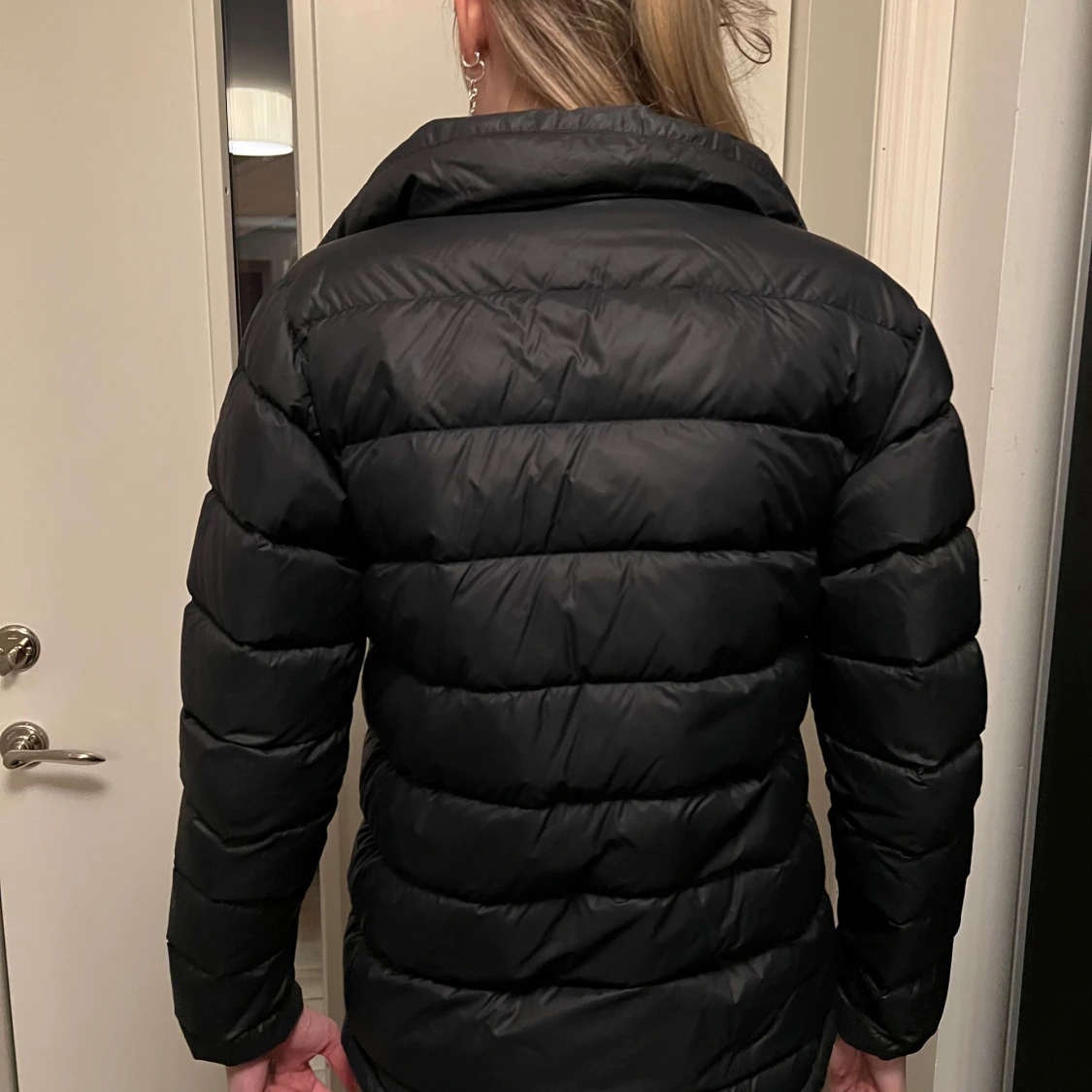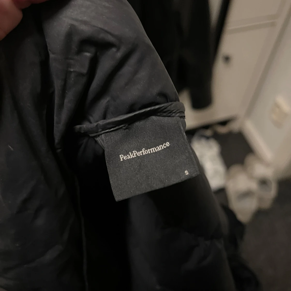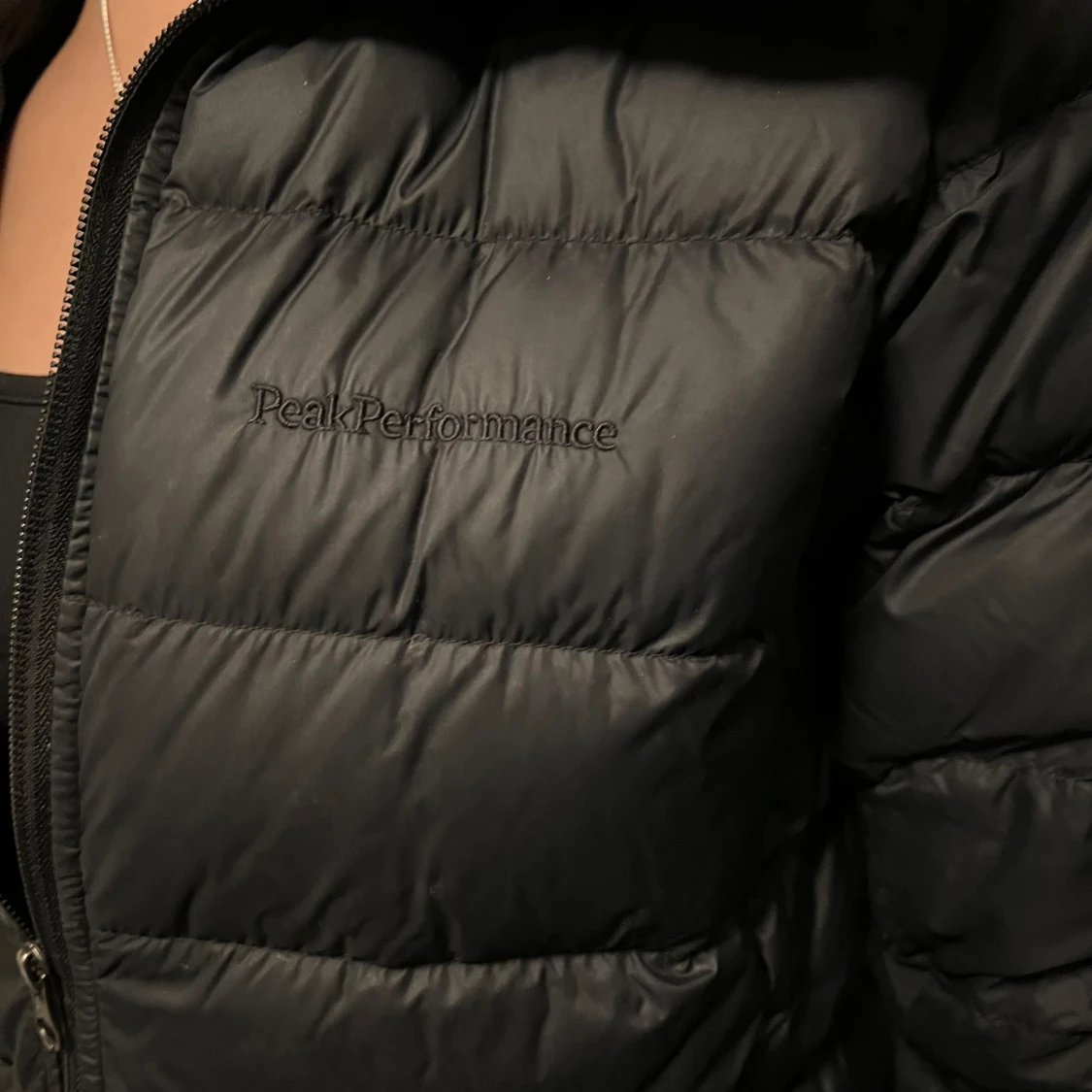 Säljer en svart dunjacka från Peak Performance i storlek S. Jackan har en klassisk pufferstil med horisontella sömmar, hög krage och dragkedja framtill.