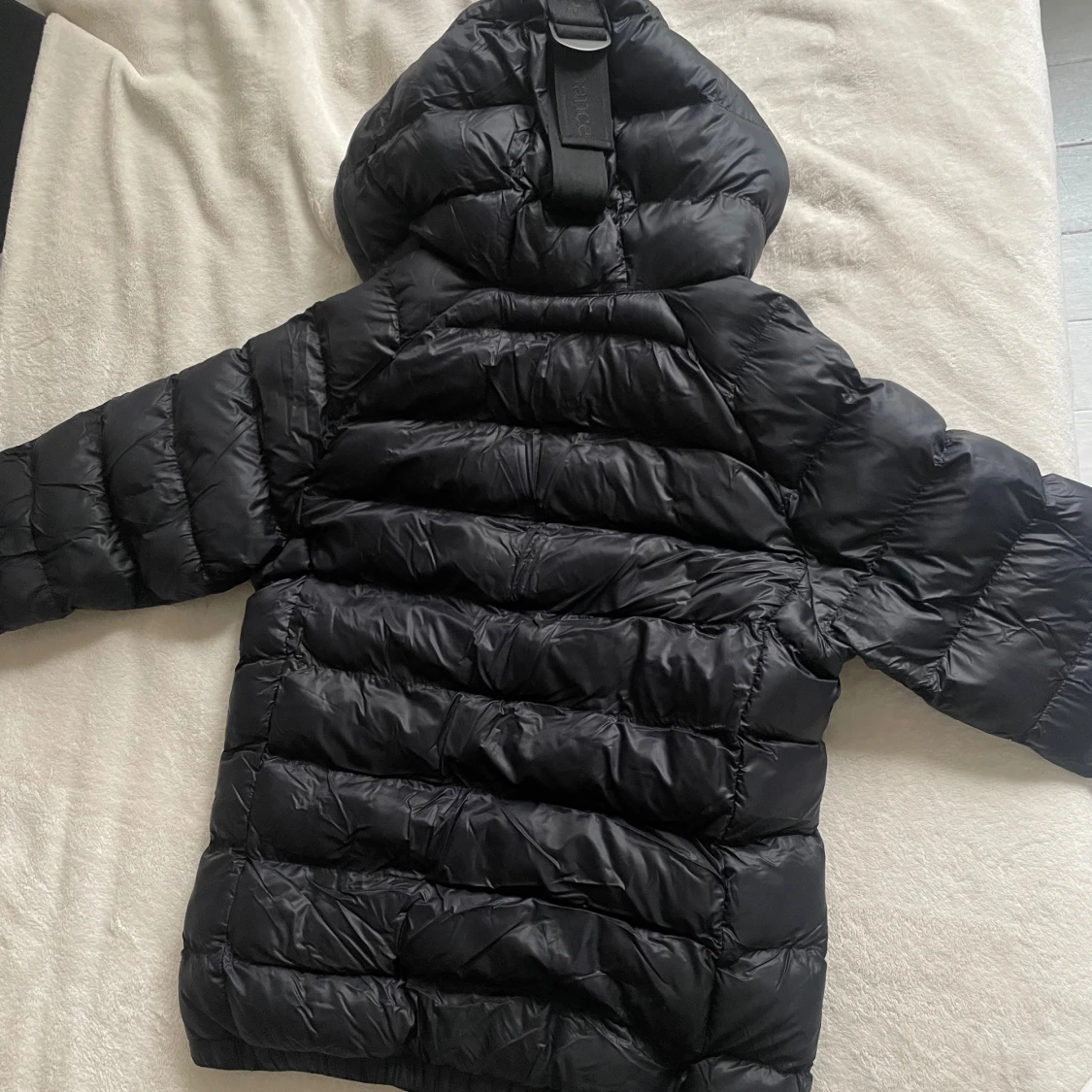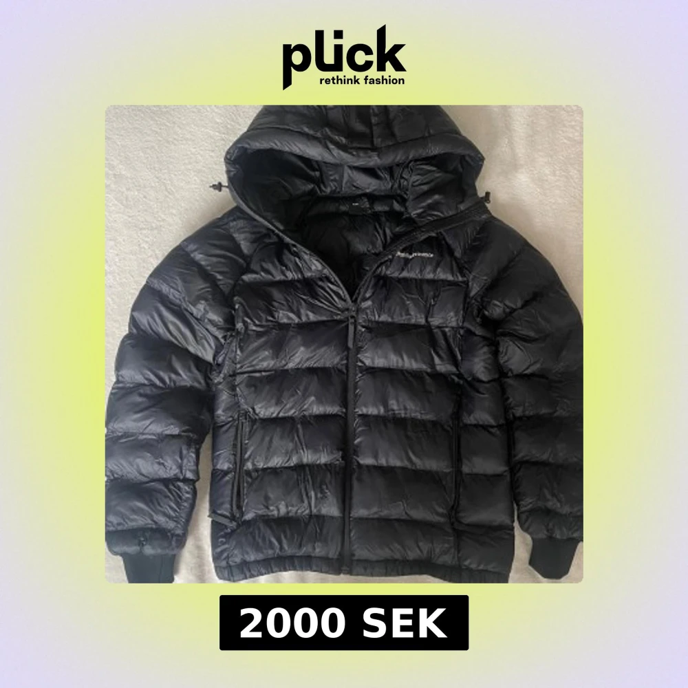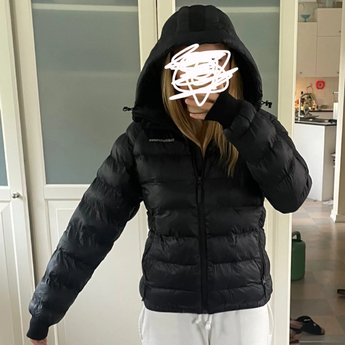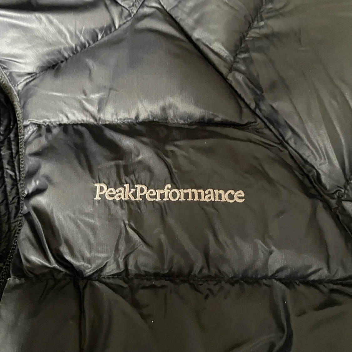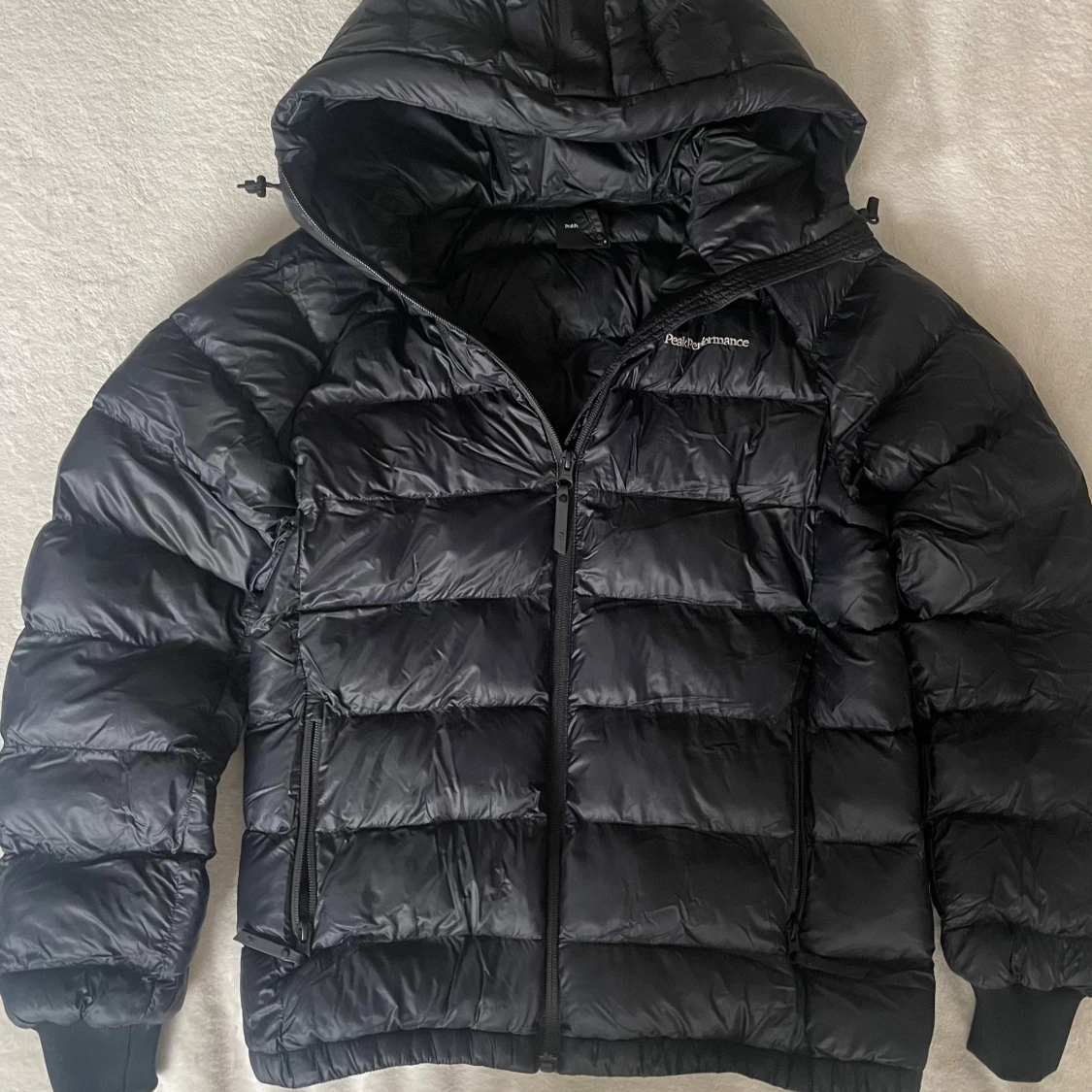 Säljer en svart dunjacka från Peak Performance med huva och dragkedja. Jackan är quiltad med breda kanaler, har två fickor med dragkedja och ribbade muddar vid ärmsluten. Perfekt för kalla dagar och riktigt snygg passform.