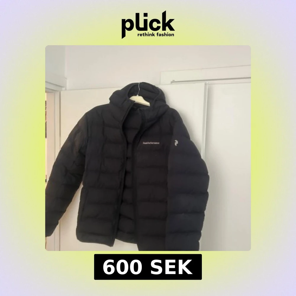 Svart dunjacka från Peak Performance med huva och diskret logga på bröstet. Endast seriösa köpare.
