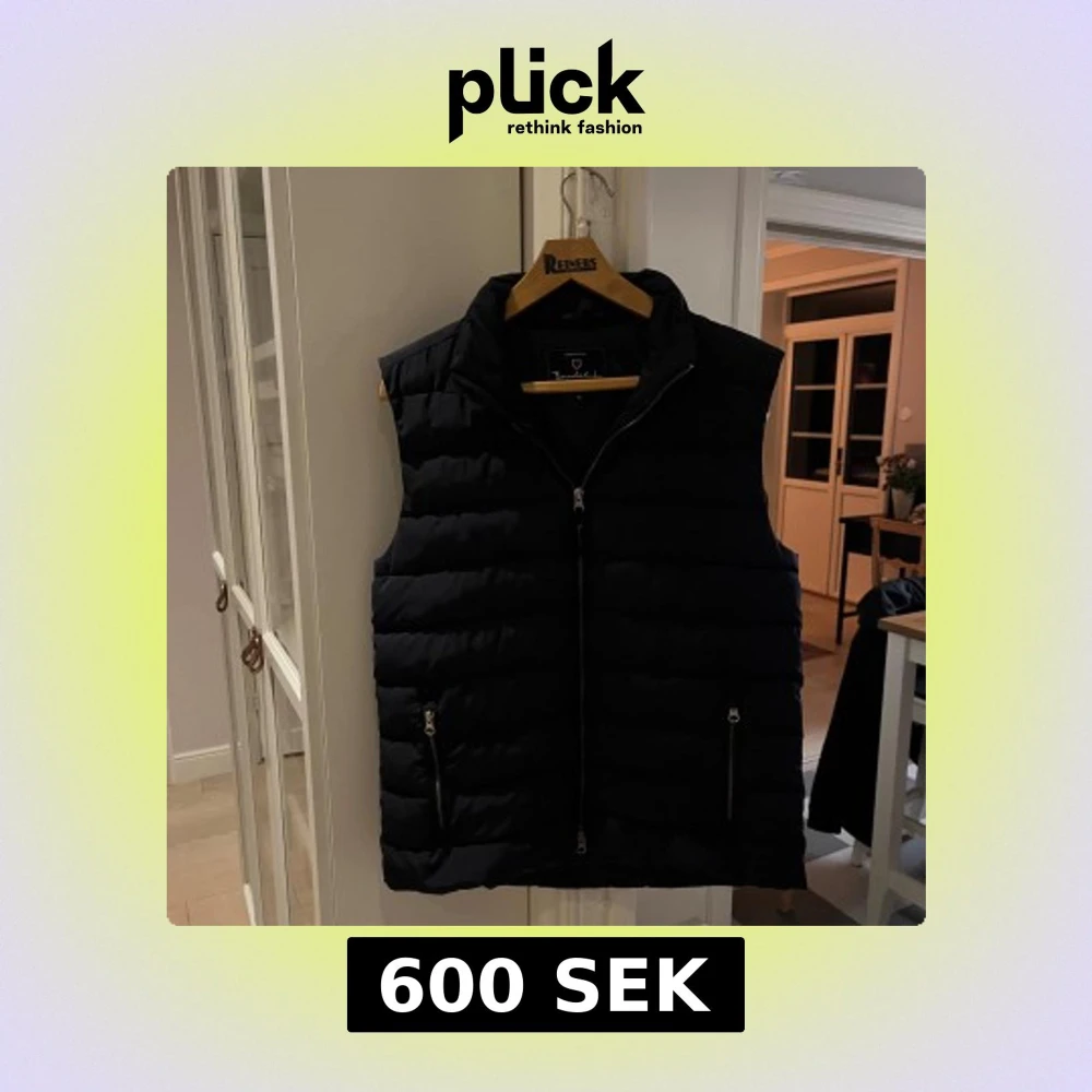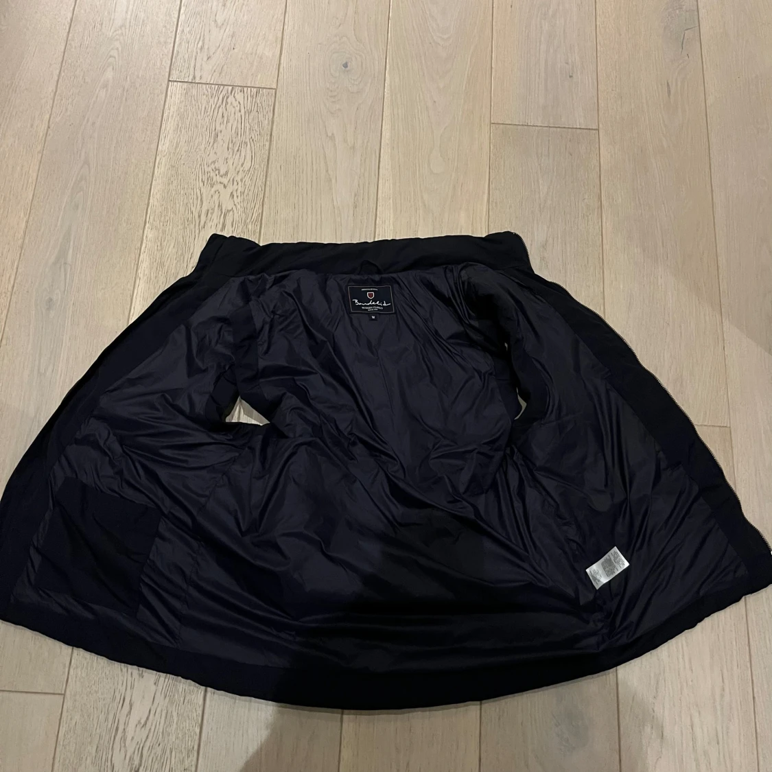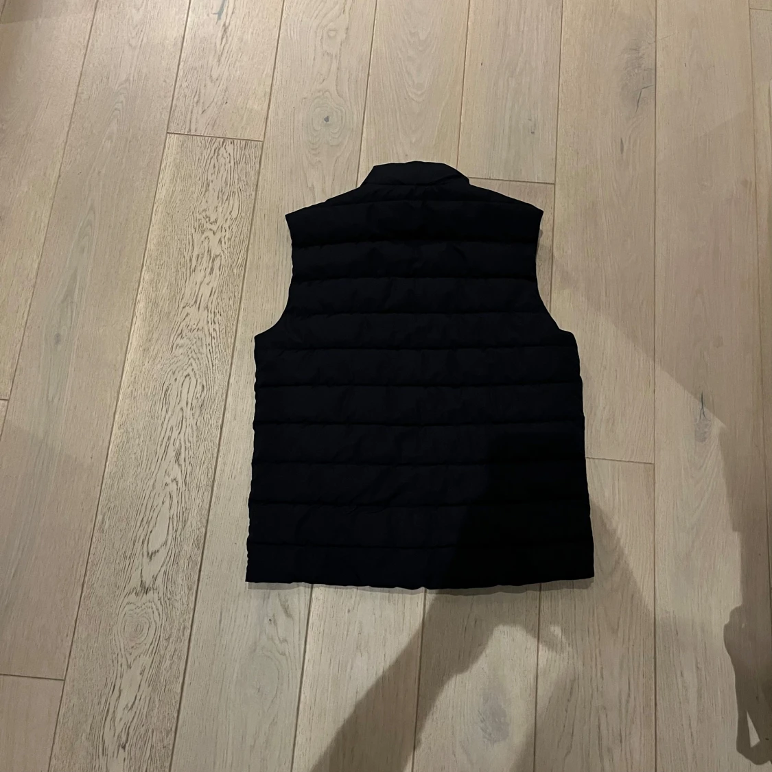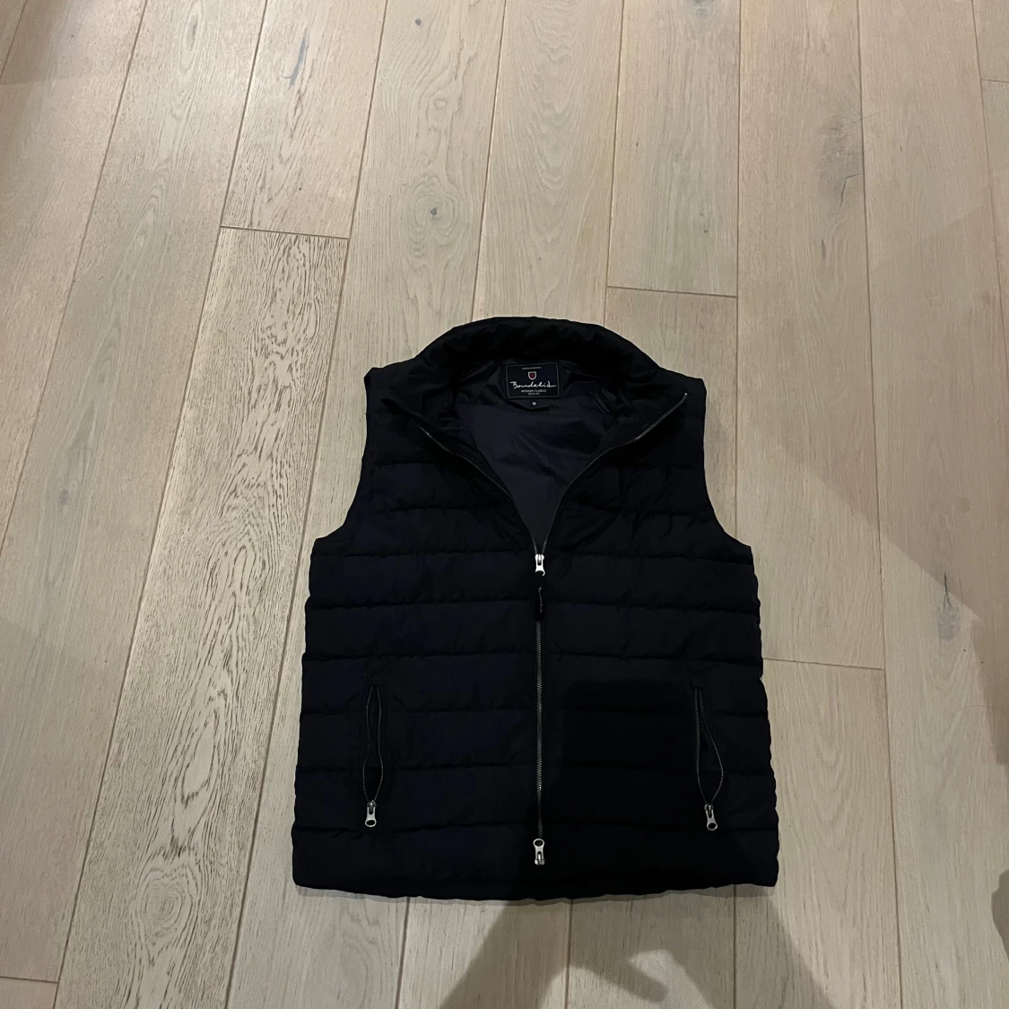 Svart dunväst från Bondelid med horisontella quiltade paneler och hög krage. Västen har två fickor med dragkedja och hel dragkedja framtill. Insidan är slät och fodrad, perfekt för lager-på-lager under kyliga dagar men också som en helt vanlig väst. Knappt använd.