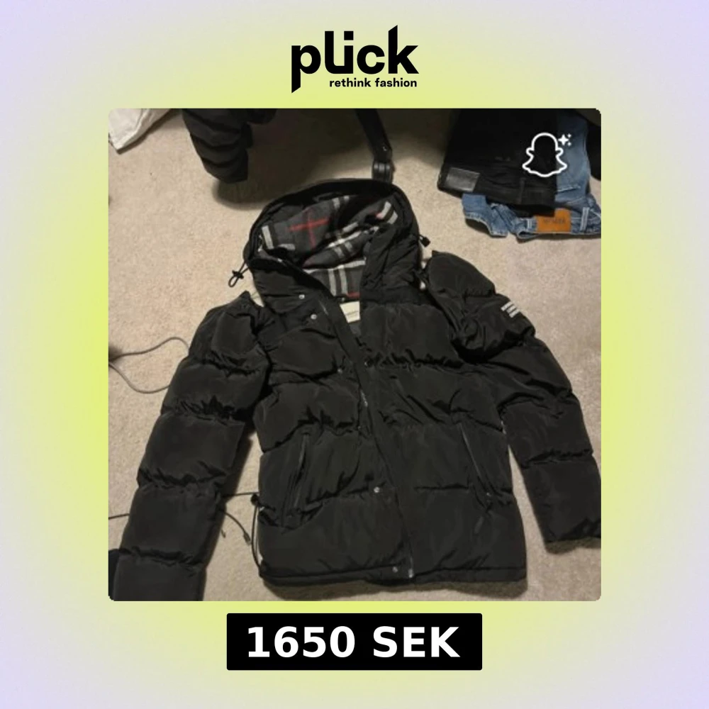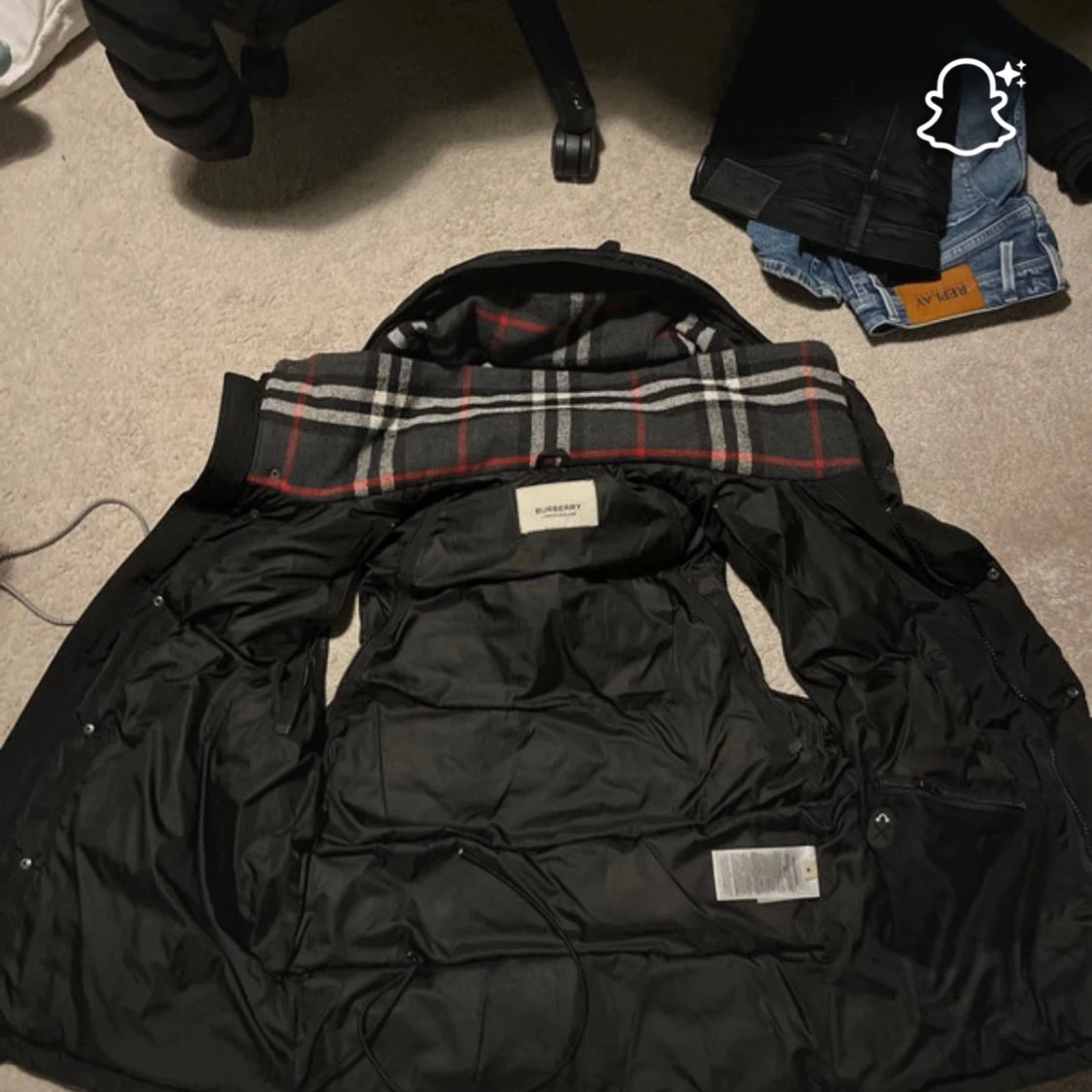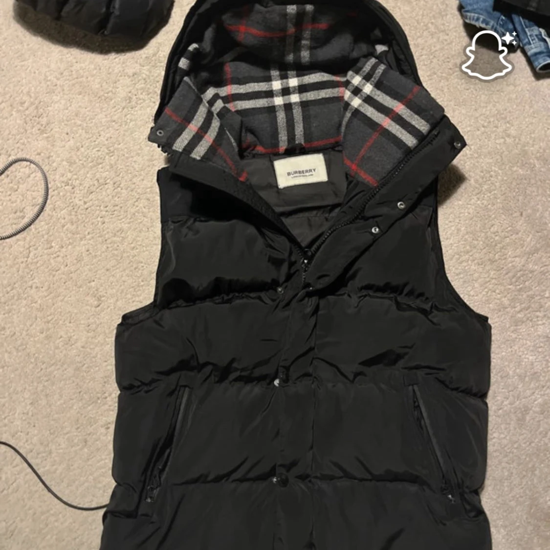 Säljer en svart dunväst från Burberry med avtagbara ärmar och huva. Insidan har klassiskt rutigt Burberry-foder i grått, vitt och rött. Västen har dragkedja och fickor med zip framtill. Perfekt för lager-på-lager och riktigt snygg streetstil.skicka helst inte tillbaka