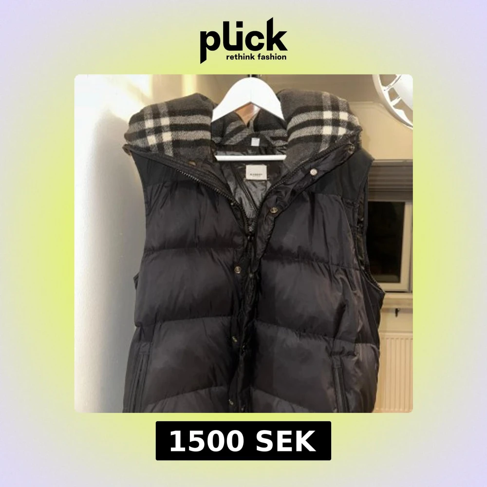 Snygg svart dunväst från Burberry med klassisk rutig huva i grått och vitt. Västen har dragkedja och knappar framtill samt två fickor med dragkedja. Perfekt för lager-på-lager och ger en cool vibe till din outfit.