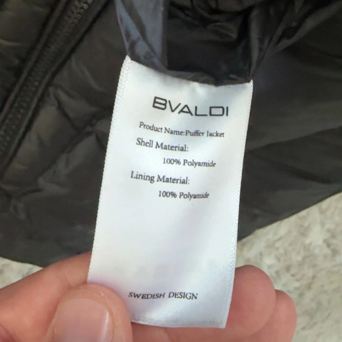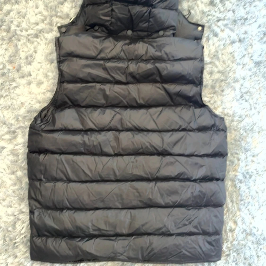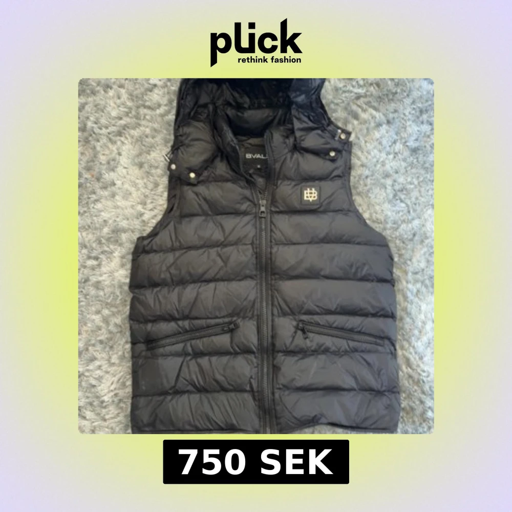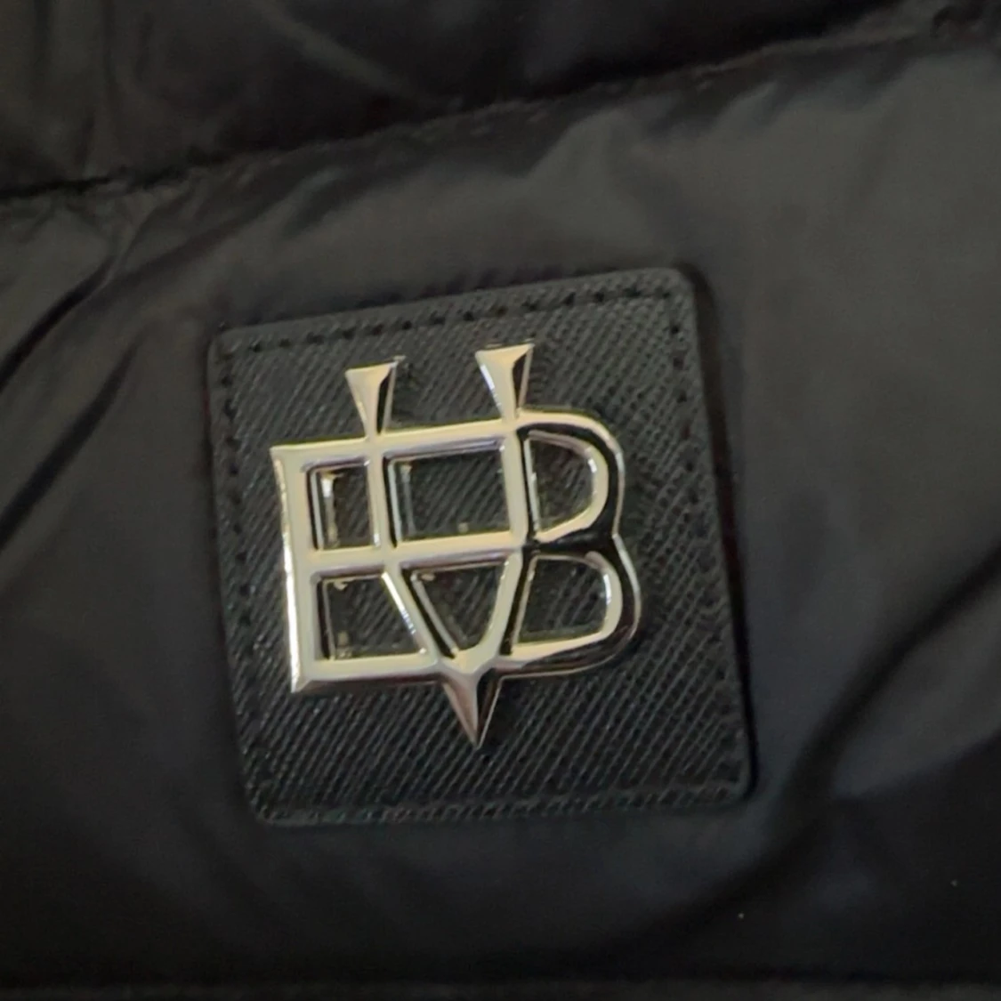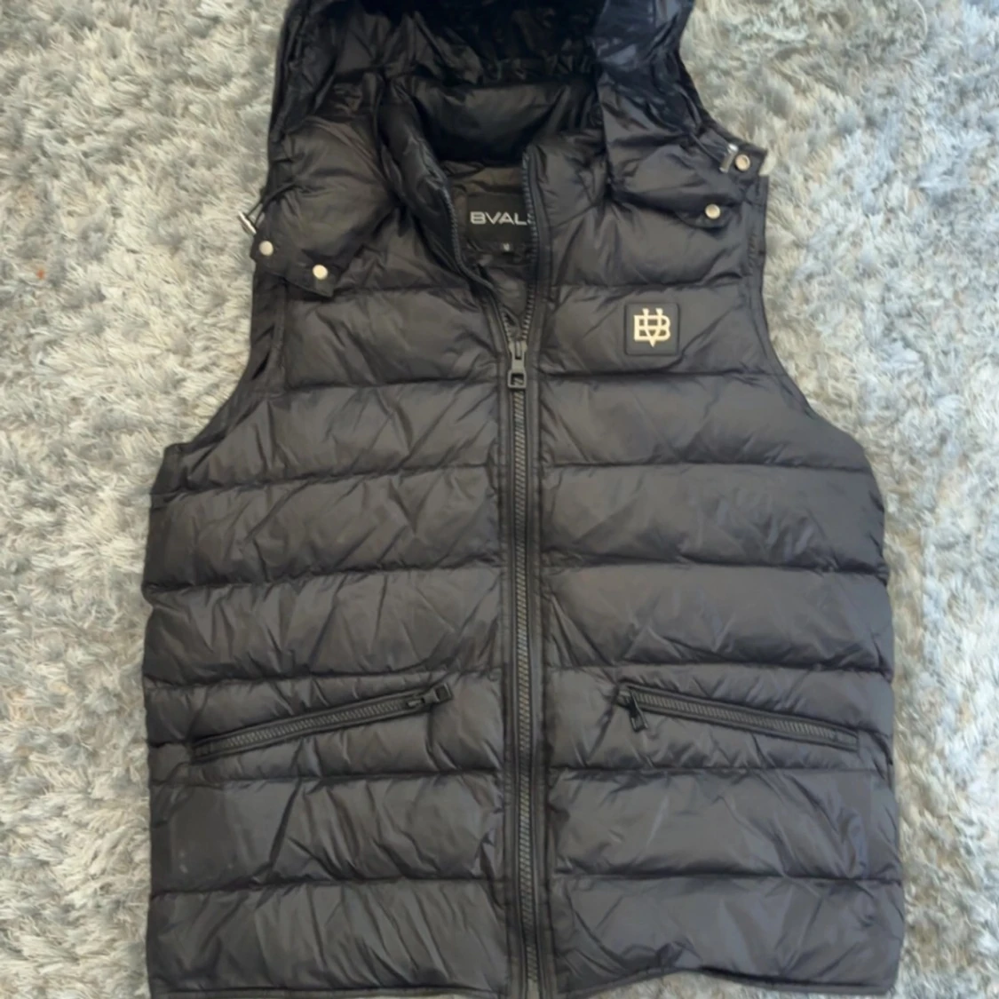 Snygg svart dunväst från BVALDI med dragkedja framtill och två fickor med dragkedja. Västen har en hög krage och avtagbar huva med tryckknappar. Märkets logga i metall på bröstet. Perfekt för lager-på-lager under kyliga dagar.
