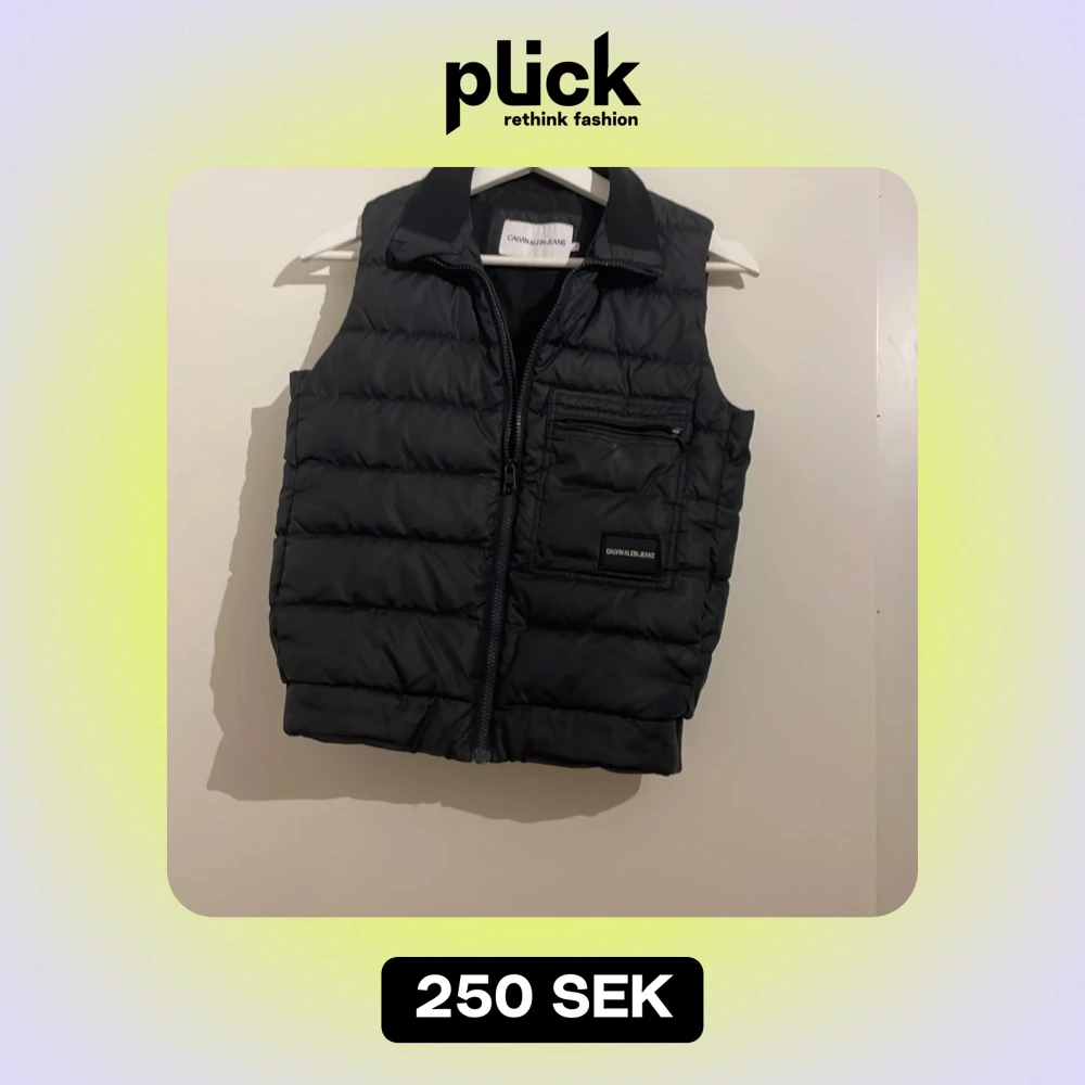 Säljer en snygg svart dunväst från Calvin Klein Jeans. Västen har en dragkedja framtill och en praktisk bröstficka med dragkedja. Perfekt för lager-på-lager under kyliga dagar. Passar både till vardags och lite mer uppklädda tillfällen.