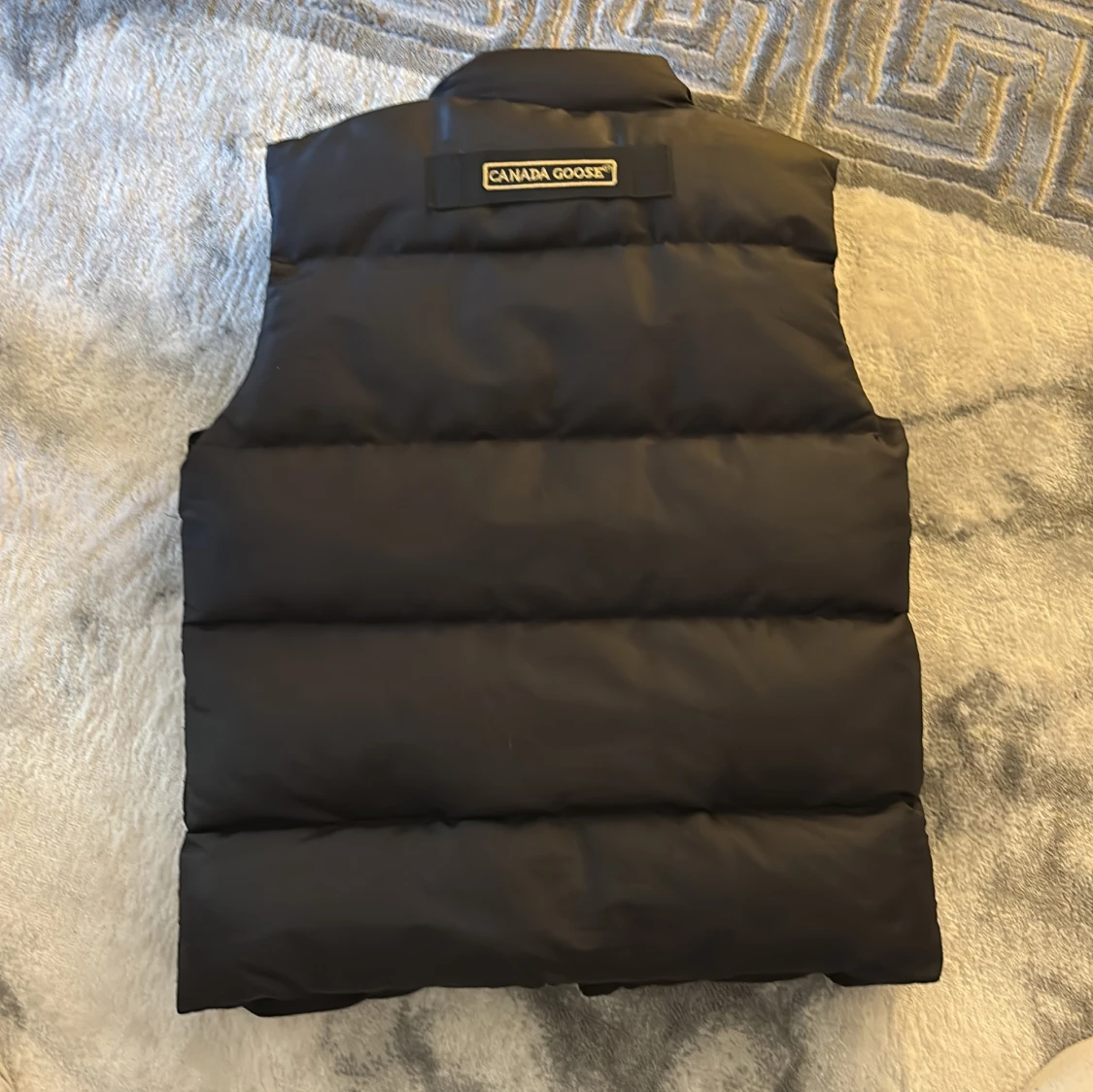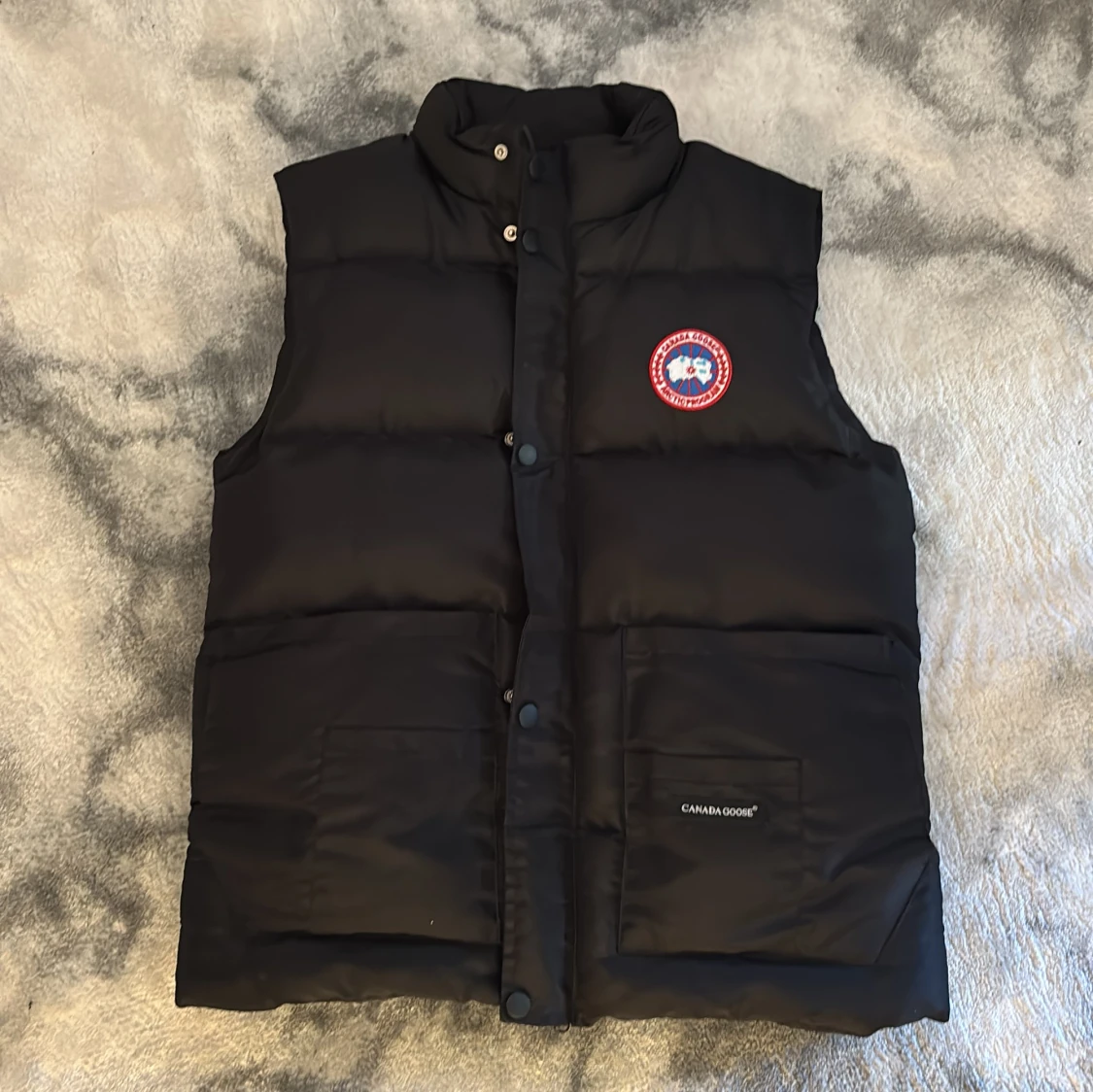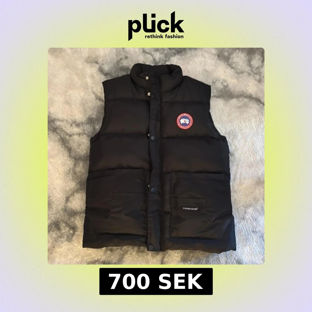 Säljer en svart dunväst från Canada Goose med klassisk logga på bröstet och stora fickor framtill. Västen har hög krage, tryckknappar och quiltad design. Perfekt för lager-på-lager och riktigt snygg till streetwear eller outdoor-stil.