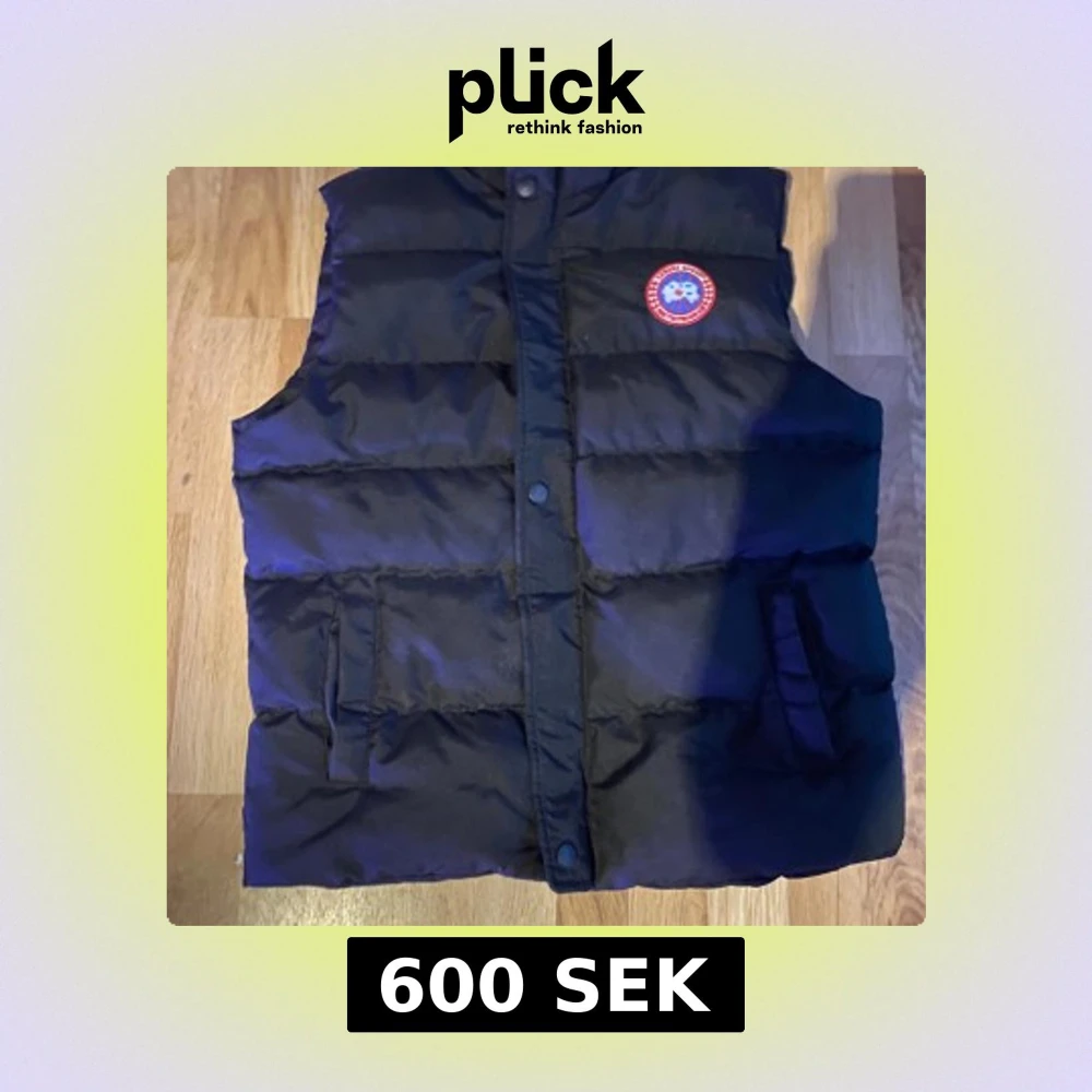 Säljer en svart dunväst från Canada Goose med ett klassiskt märke på bröstet. Västen har knappar och är perfekt för kyligare dagar. Den är stilren och lätt att matcha med olika outfits.