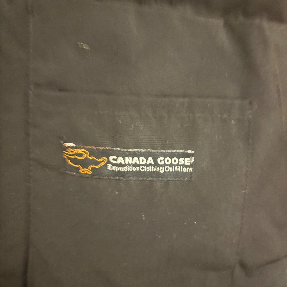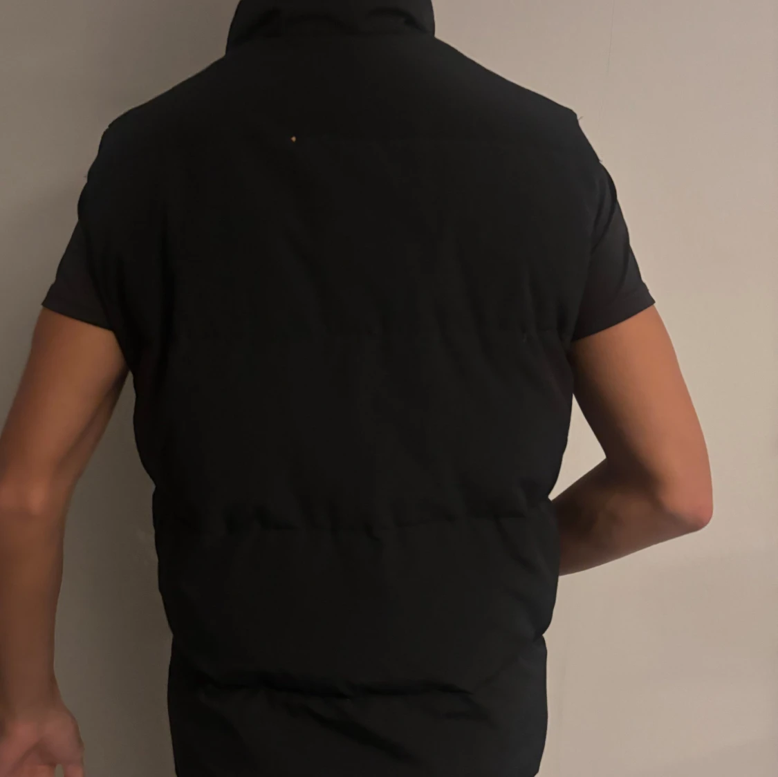 Säljer en svart dunväst från Canada Goose med hög krage och tryckknappar framtill. Västen har broderad logga och lönnlöv på bröstet samt en tydlig etikett på fickan. Perfekt för lager-på-lager och riktigt snygg till streetwear.