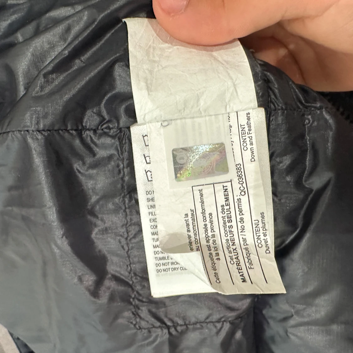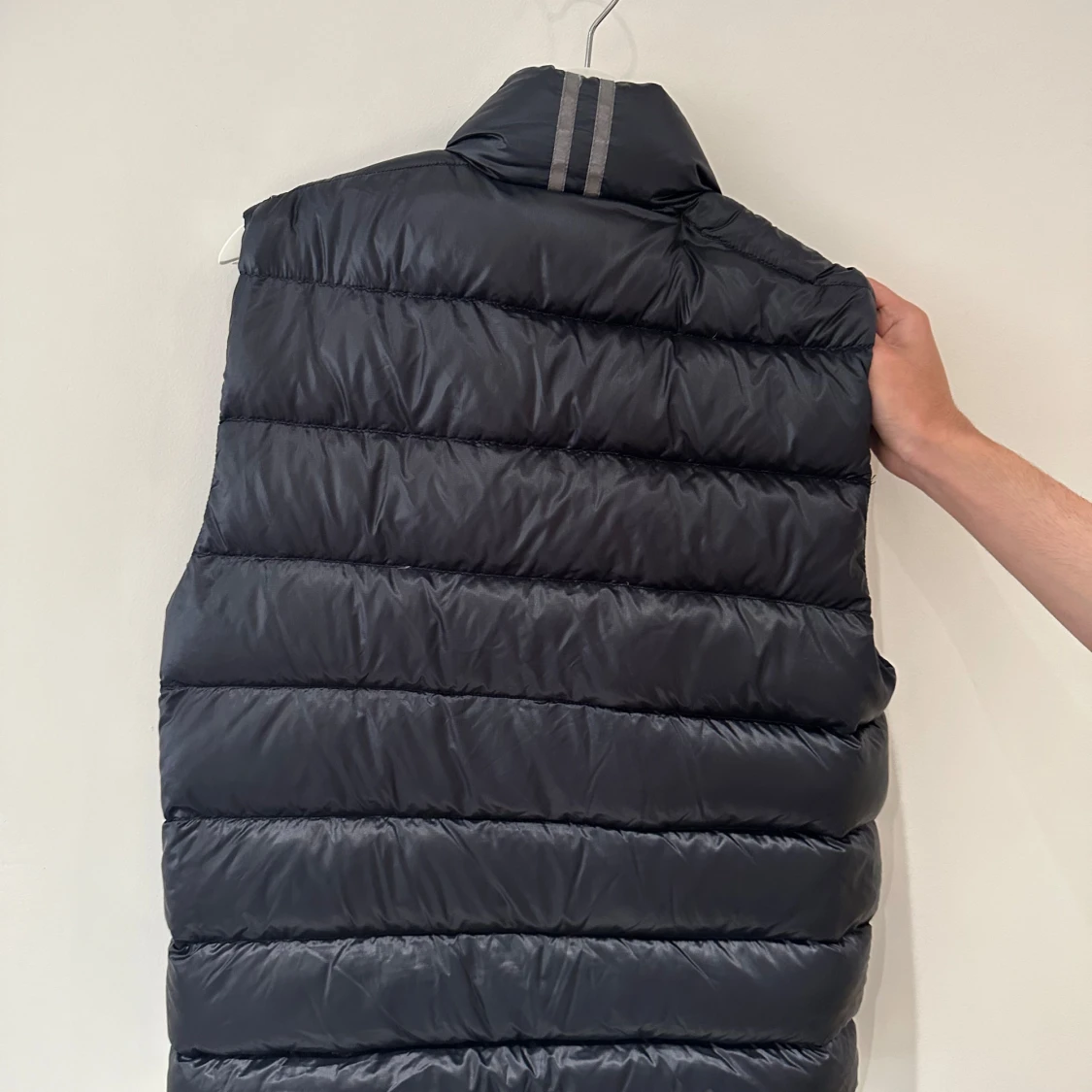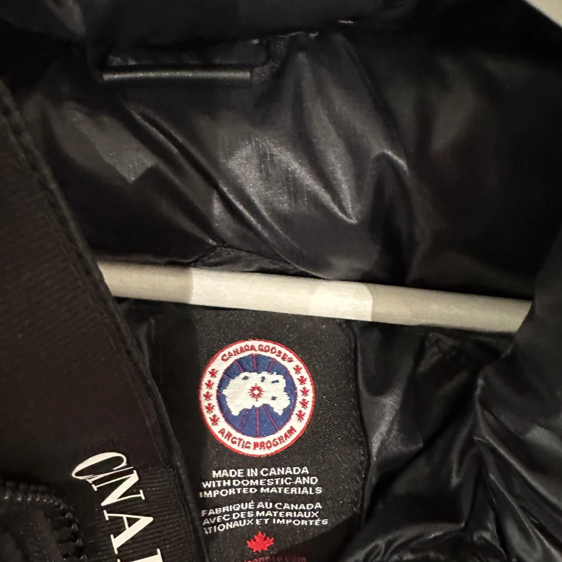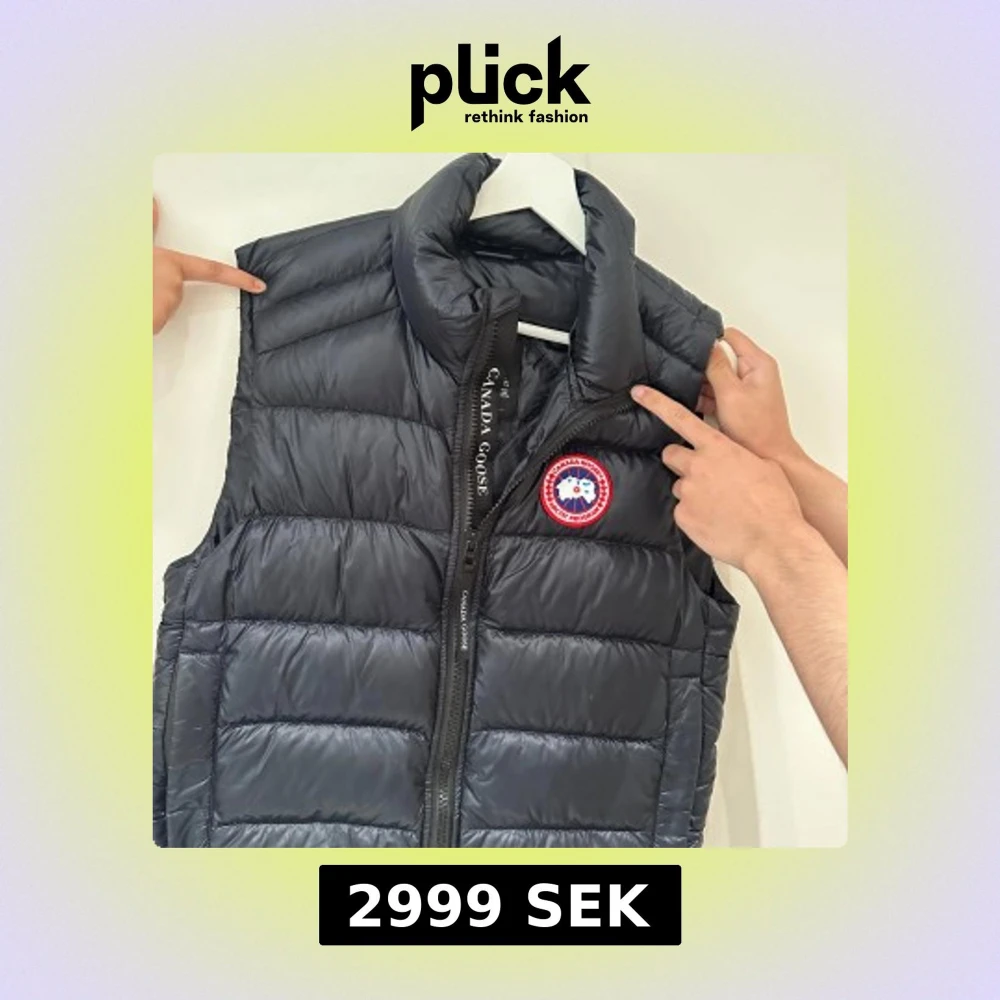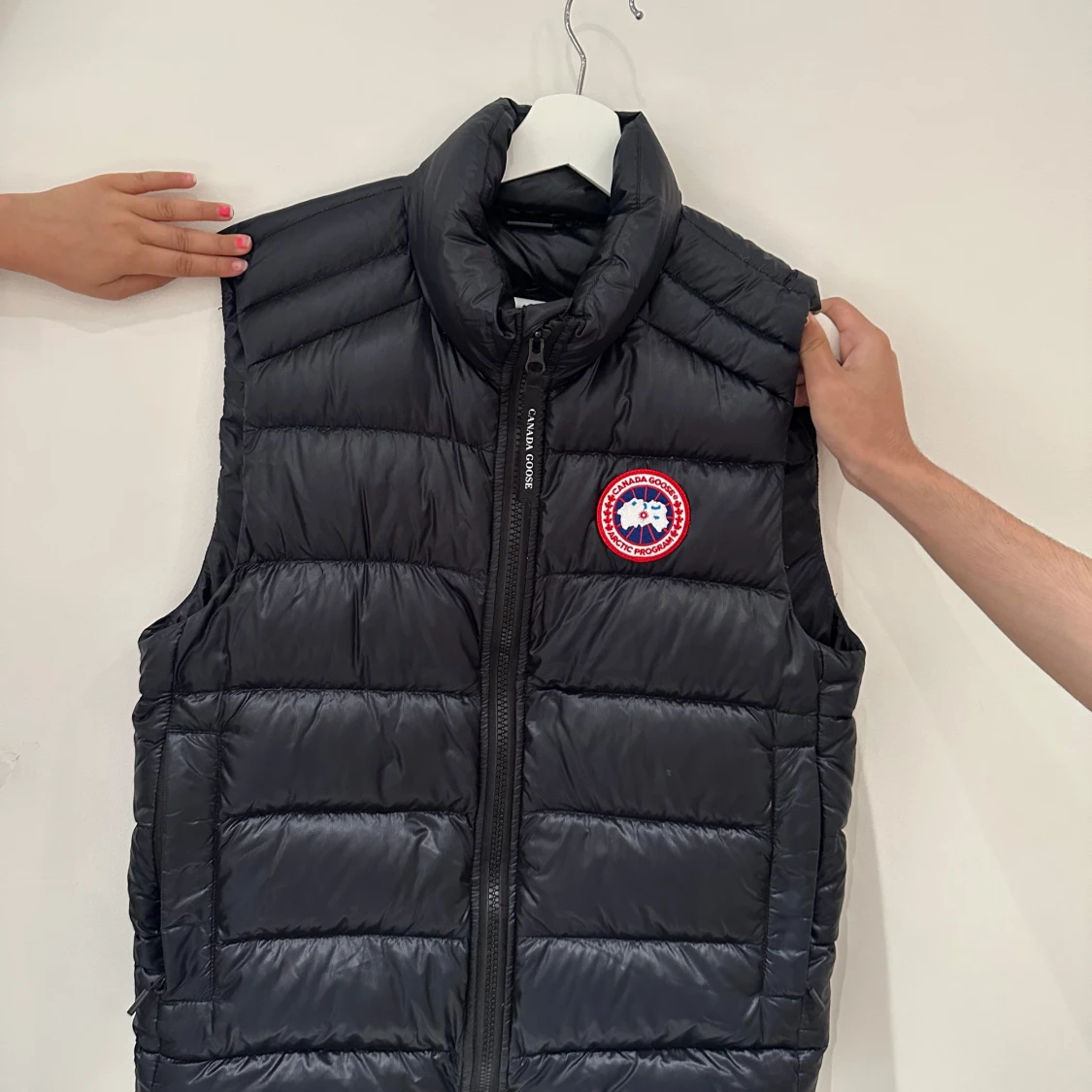 Säljer en svart dunväst från Canada Goose med klassisk logga på bröstet. Västen har hög krage, quiltad design och dragkedja framtill. Perfekt för lager-på-lager och riktigt snygg till streetwear eller chillare outfits.