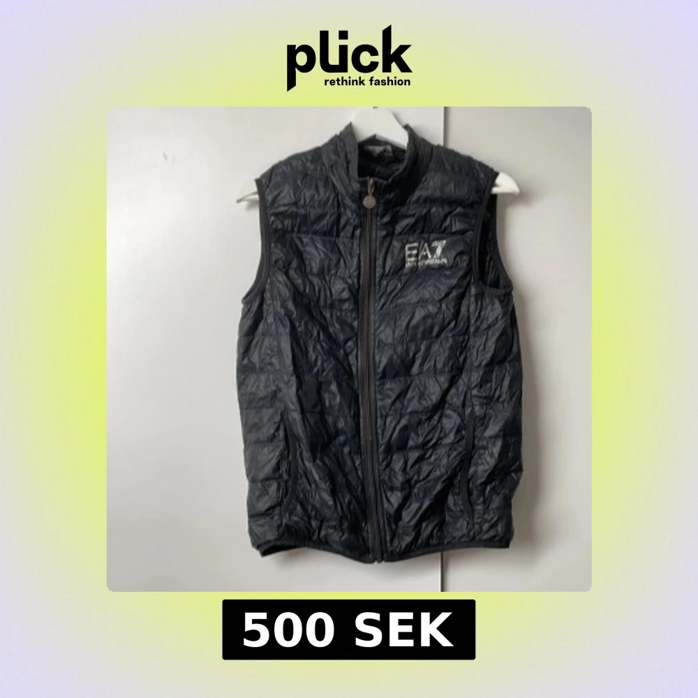 Svart quiltad dunväst från EA7 Emporio Armani med hög krage och dragkedja framtill. Västen har en stilren design med logga i silver på bröstet och två fickor. Perfekt för lager-på-lager och snygg till streetwear. Finns ett jätte litet hål på sidan därför jag säljer den billigt