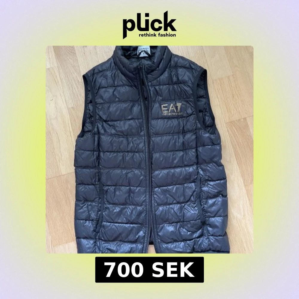 Snygg svart dunväst från Emporio Armani EA7 med guldfärgad logga på bröstet. Västen har quiltad design och dragkedja framtill. Nypris 1800 kr, men säljer för 700, pris kan diskuteras