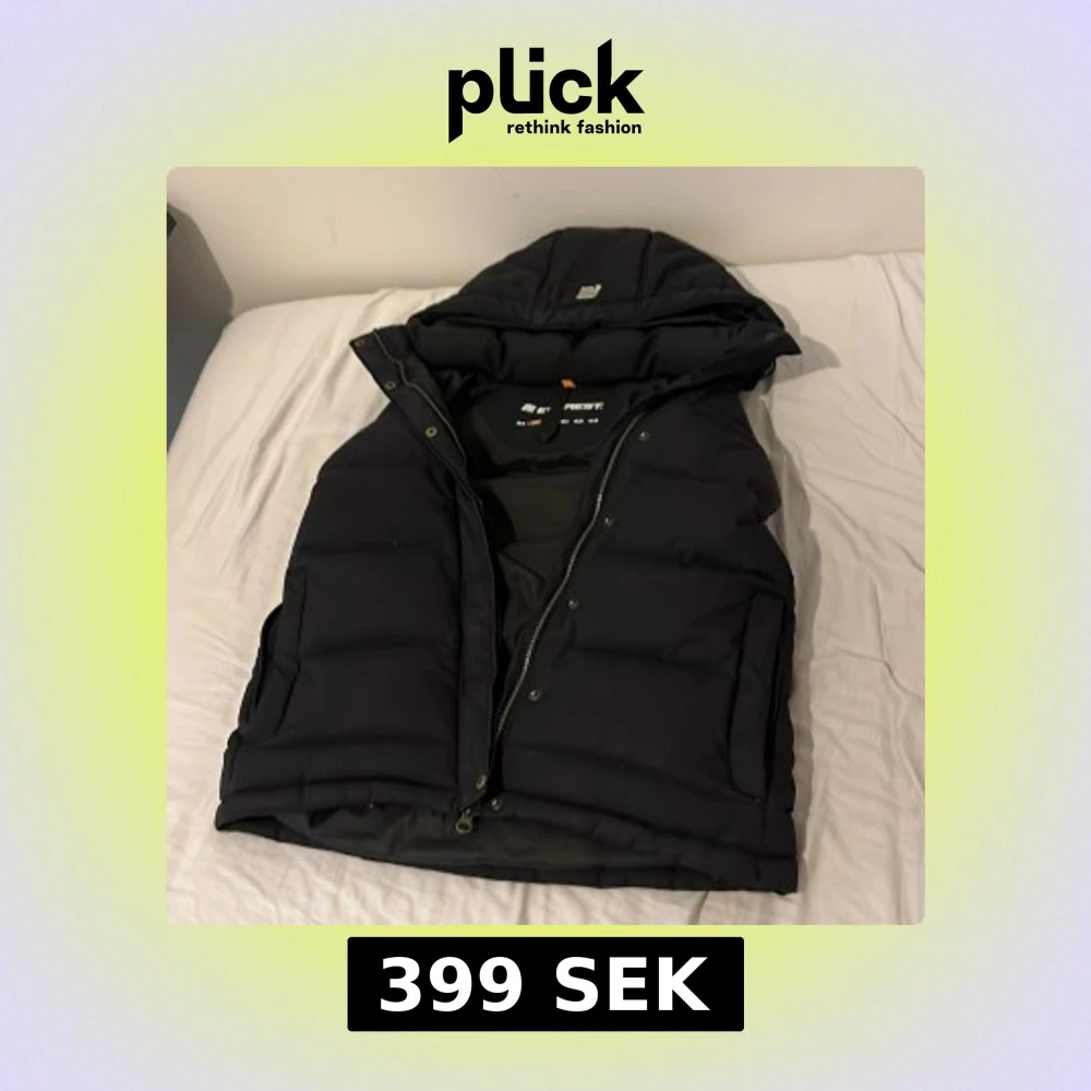 Svart dunväst från Everest i storlek 36. Västen har en stor, vadderad huva, dragkedja framtill och tryckknappar. Den är quiltad och har två sidofickor. Perfekt för kyliga dagar när du vill ha en sportig och clean look.
