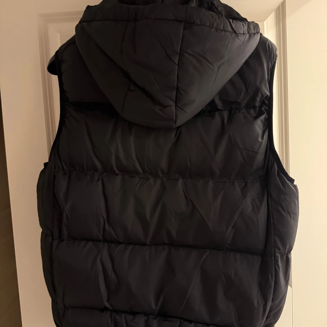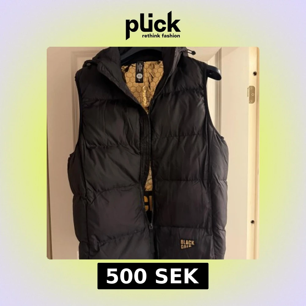 Säljer en svart dunväst från Black Gold med huva och dragkedja framtill. Insidan har ett coolt guldigt hexagonmönster som ger extra edge. Västen är quiltad och har en loose passform, perfekt att slänga över en hoodie när det är kallt ute.