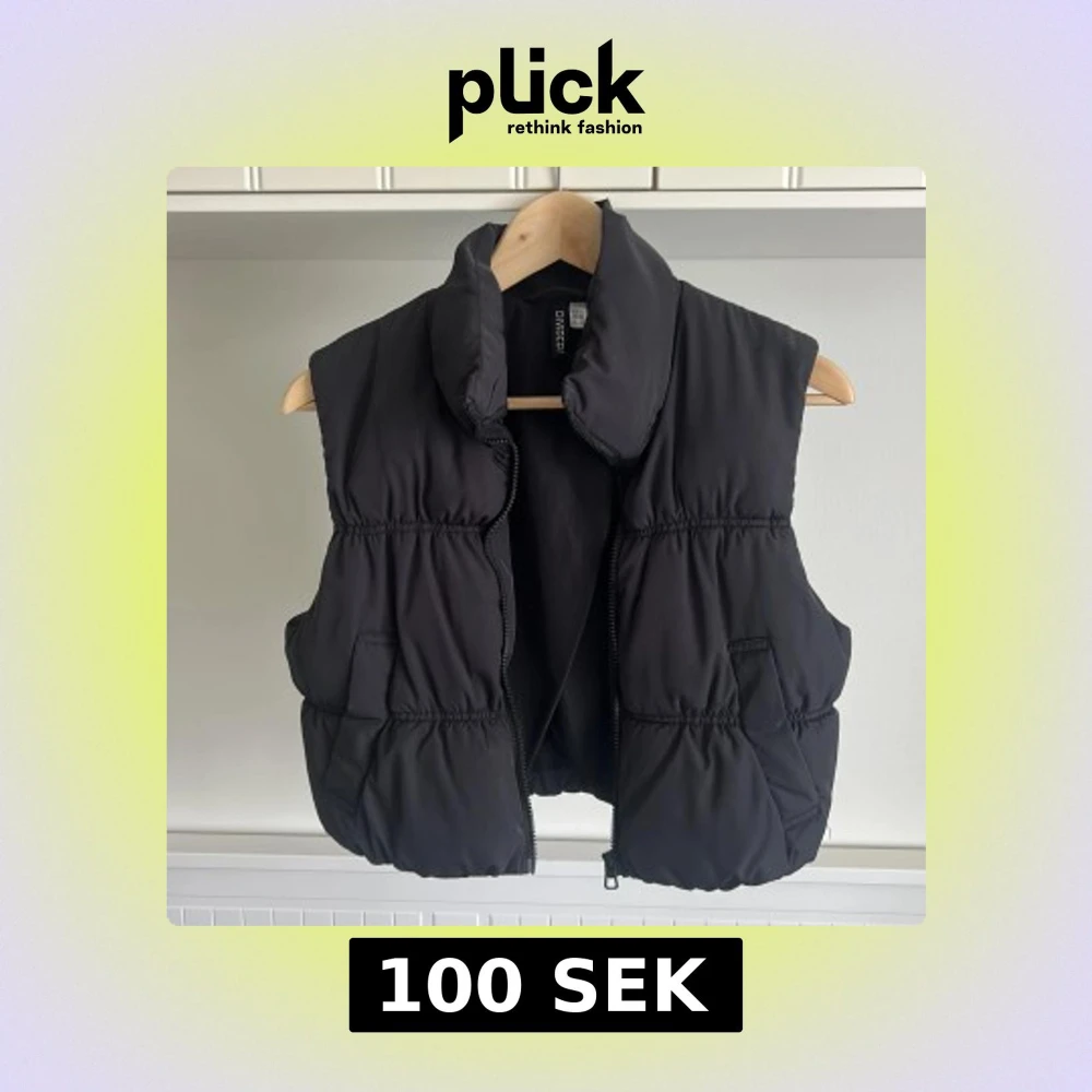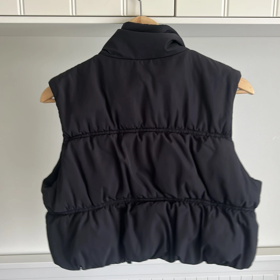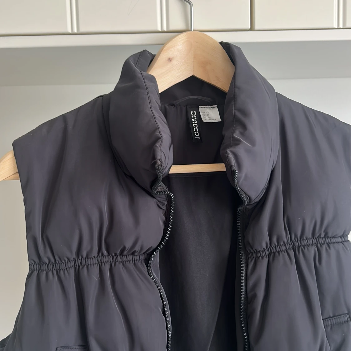 Säljer en svart dunväst från H&M med hög krage och dragkedja framtill. Västen har en puffig, quiltad design och två fickor på sidorna. Perfekt att slänga över en hoodie eller tröja för extra värme. Pris går att diskutera