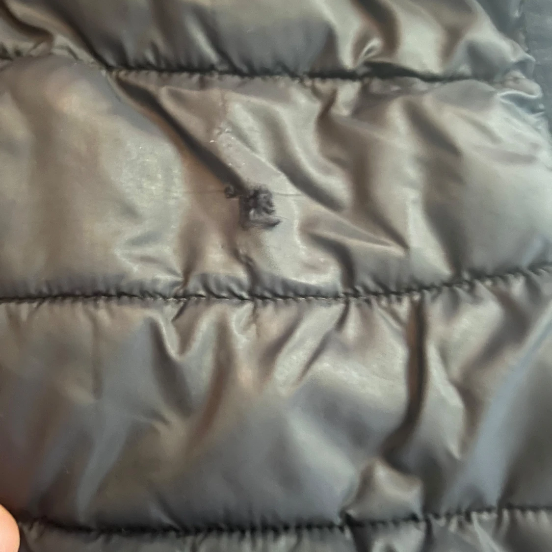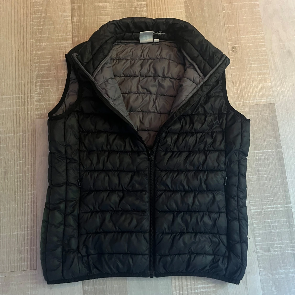Säljer en svart quiltad dunväst från Hangten med grå insida. Västen har hög krage och dragkedja framtill. Perfekt att slänga över en hoodie för extra värme. Klassisk och stilren design som funkar till det mesta. Stolek M men är mer som S skulle jag säga.