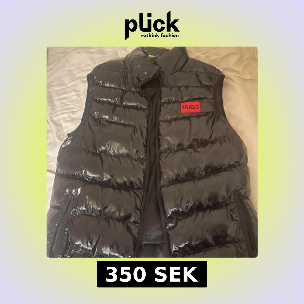 Snygg svart dunväst från Hugo med glansig finish och stora röda logotyper både fram och bak. Västen har dragkedja och två fickor med dragkedja på sidorna. Perfekt för lager-på-lager och ger en cool streetstyle-vibe.