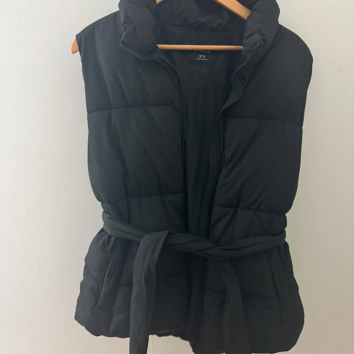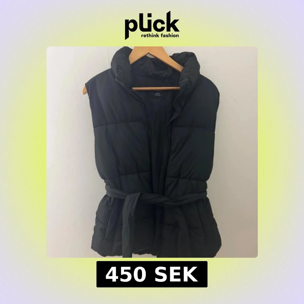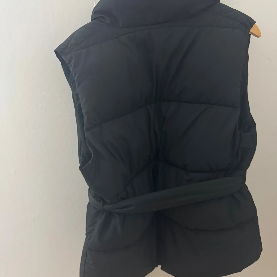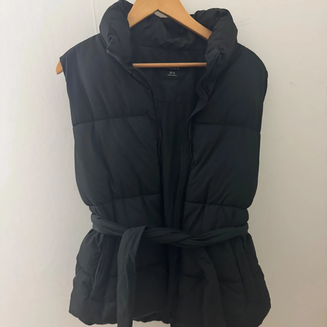 Svart dunväst från Lindex med quiltad design och hög krage. Västen har dragkedja framtill och ett bälte i midjan för snygg passform. Perfekt att slänga över en hoodie eller stickad tröja när det är kyligt ute. Säljer den då den är stor på mig