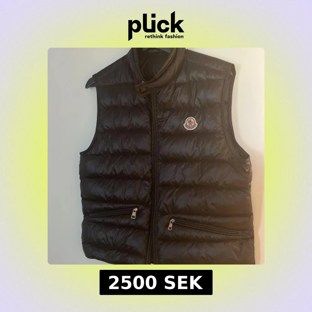 Snygg svart dunväst från Moncler med glansig finish och klassisk logga på bröstet. Västen har två dragkedjefickor framtill och hög krage. Perfekt att slänga över en hoodie eller tröja för extra värme och stilpoäng.