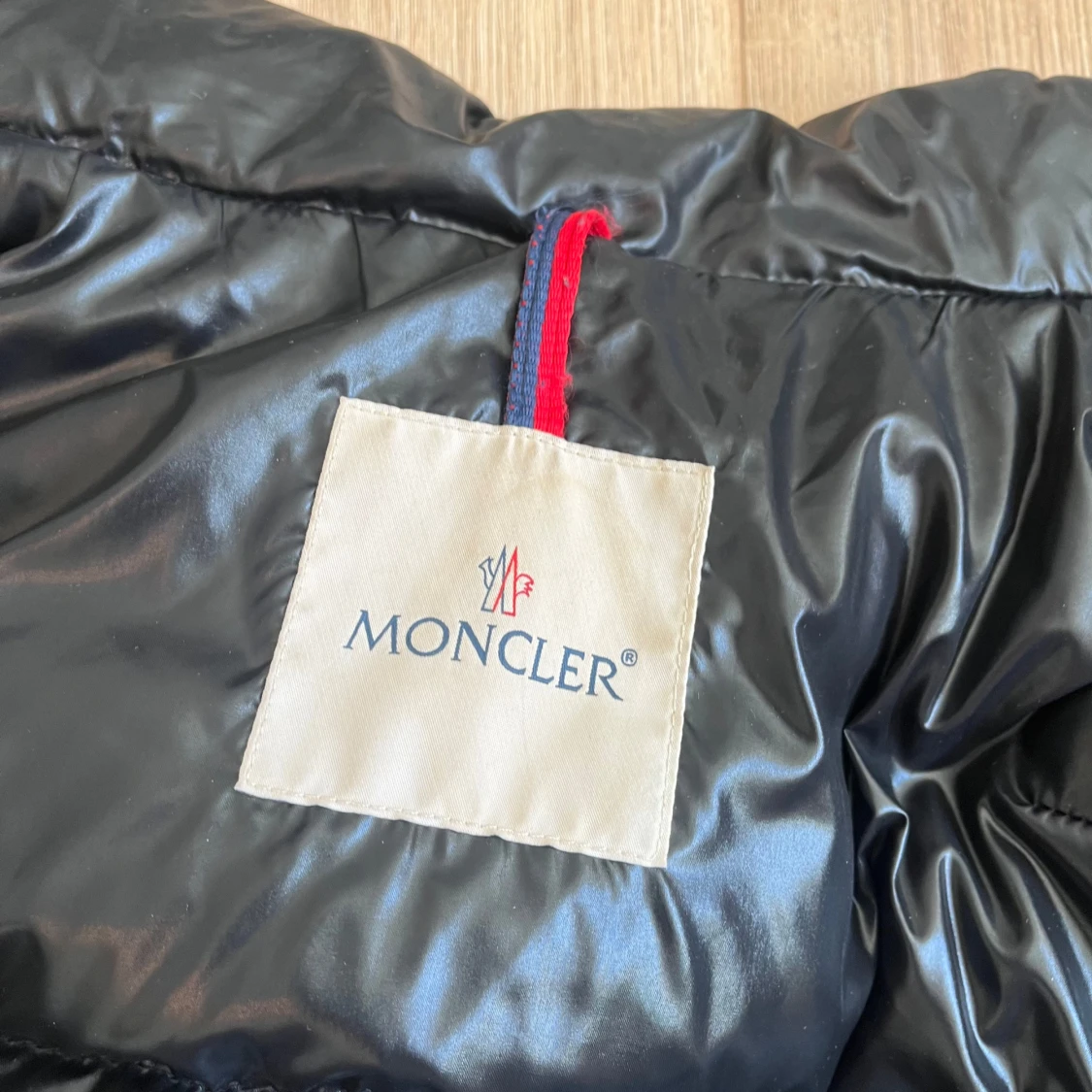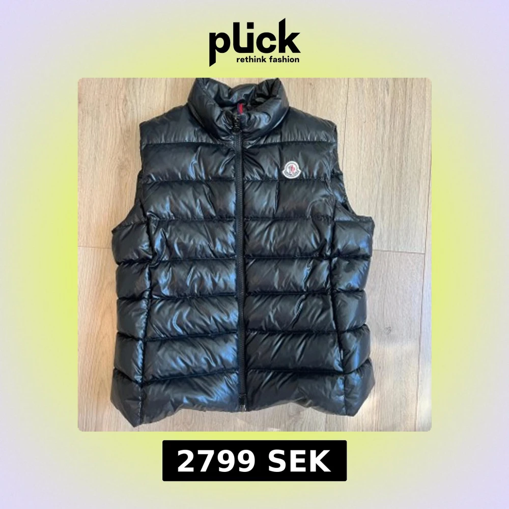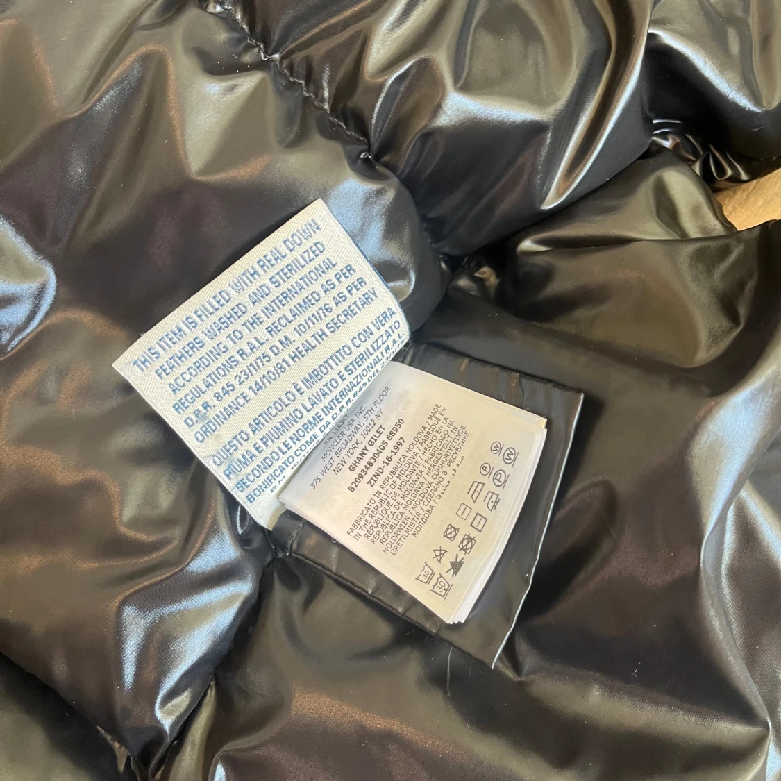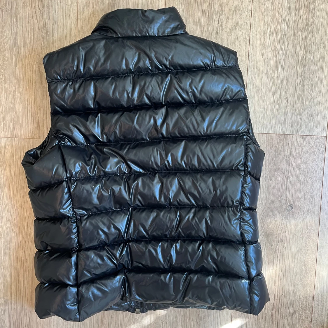 Svart, glansig dunväst från Moncler med hög krage och klassisk logga på bröstet. Västen har quiltad design, dragkedja framtill och coolt serietidningsmärke på insidan. Perfekt för lager-på-lager och streetstyle. Sist 5