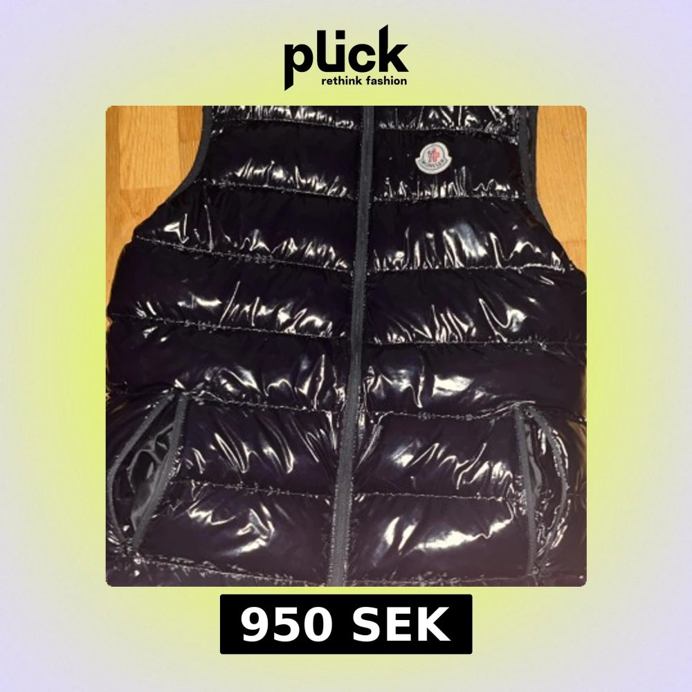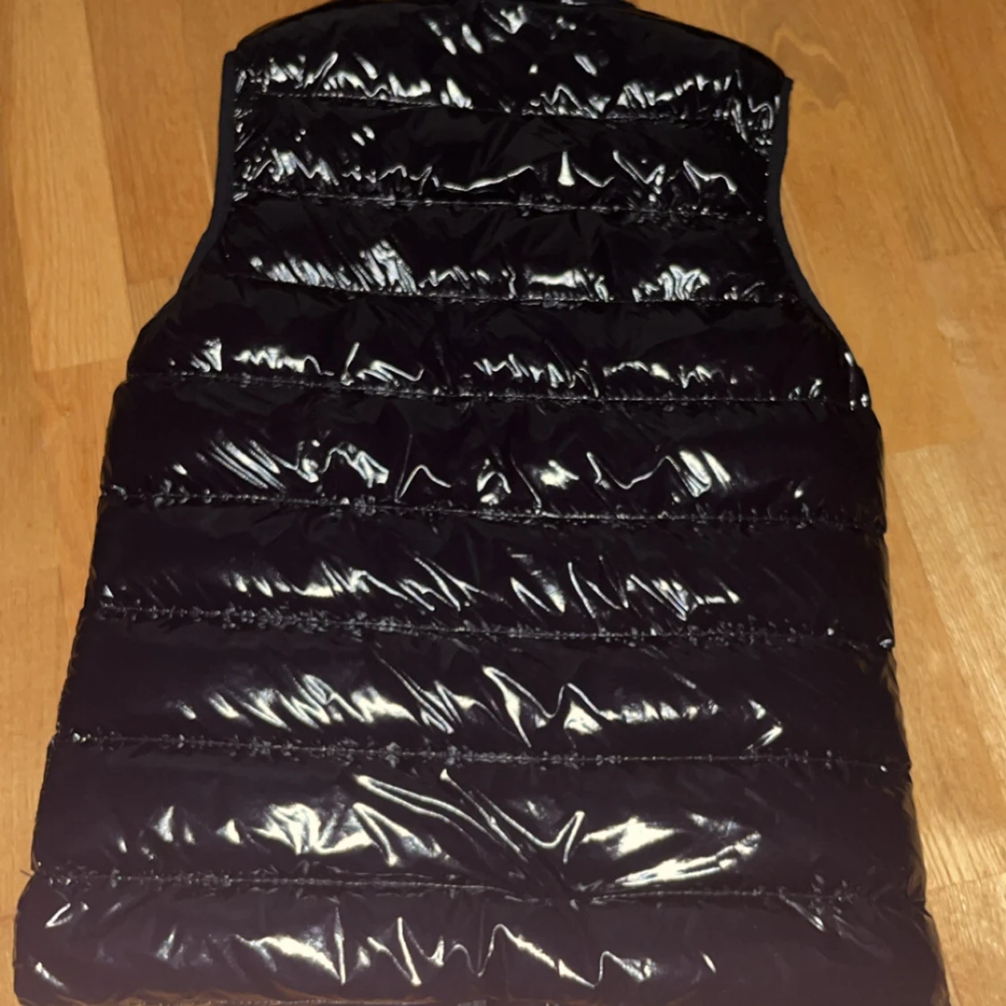 Säljer en glansig svart dunväst från Moncler med dragkedja framtill och två fickor. Västen har Moncler-logga på bröstet och är quiltad för extra värme. Perfekt för lager-på-lager under kyliga dagar dragkedjan är lite sönder tar 100 kr extra om man vill att jag ska fixa den