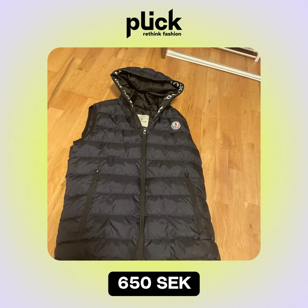 Säljer en snygg svart dunväst från Moncler i mycket bra skick. Västen har en dragkedja framtill och en broderad Moncler-logga på bröstet. Den är perfekt för höst och vår, med en stilren design och en praktisk huva. Passar både till vardags och lite finare tillfällen.
