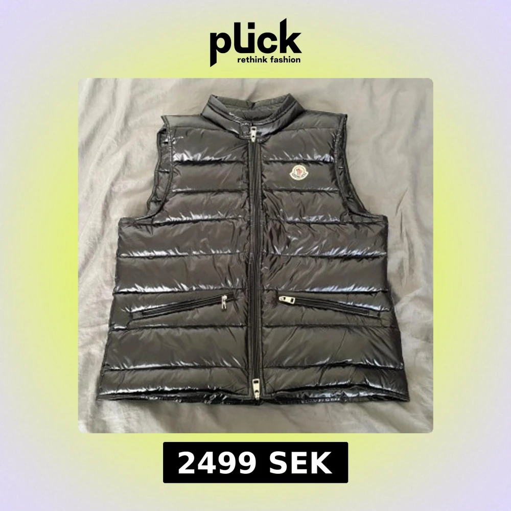 Snygg svart dunväst från Moncler med glansig finish och klassisk logga på bröstet. Västen har två dragkedjefickor framtill och stängs med dragkedja. Perfekt för lager-på-lager och ger en clean streetstyle-vibe.