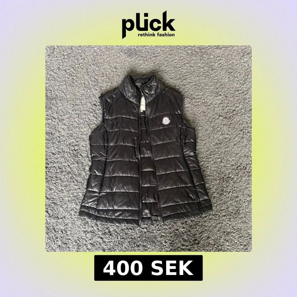 Säljer en svart dunväst från Moncler med klassisk quiltad design och hög krage. Storlek L dam