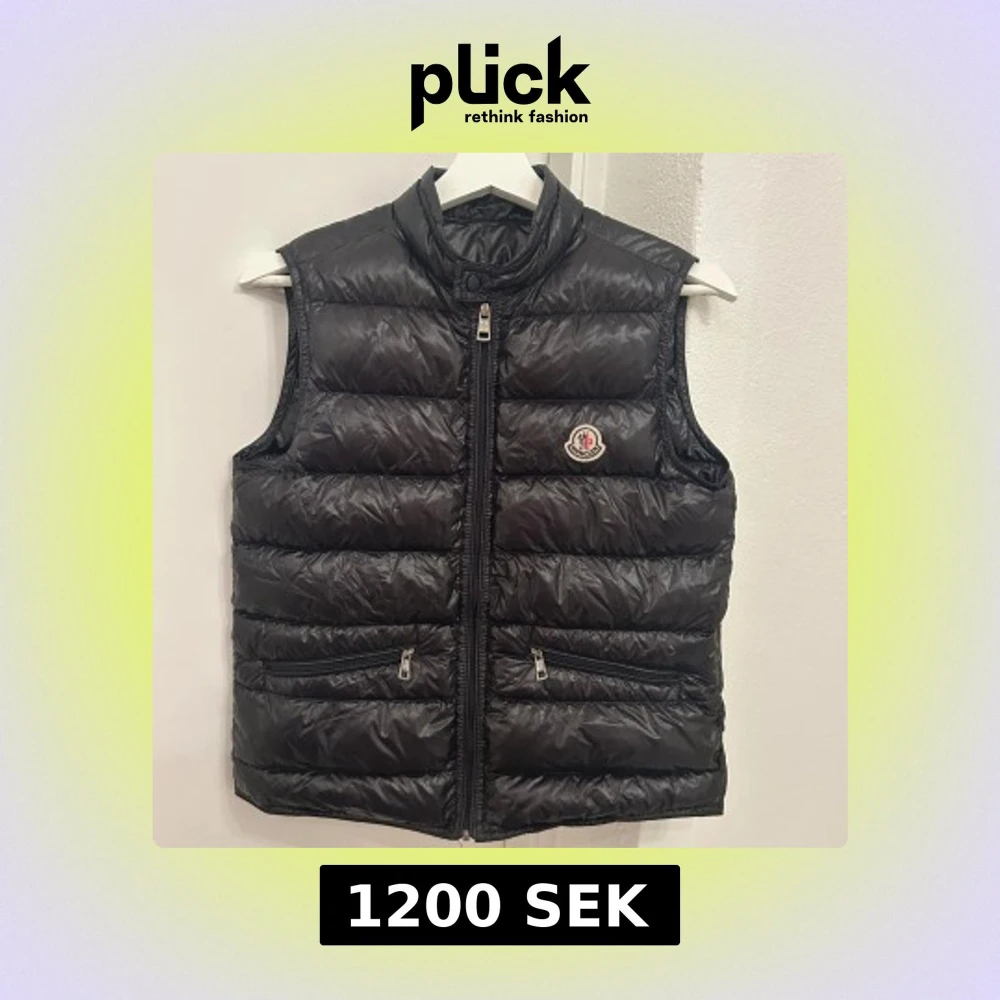 Snygg svart dunväst från Moncler med klassisk logga på bröstet. Västen har hög krage, två fickor med dragkedja och quiltad design. Perfekt att slänga över en hoodie eller tröja för extra värme.