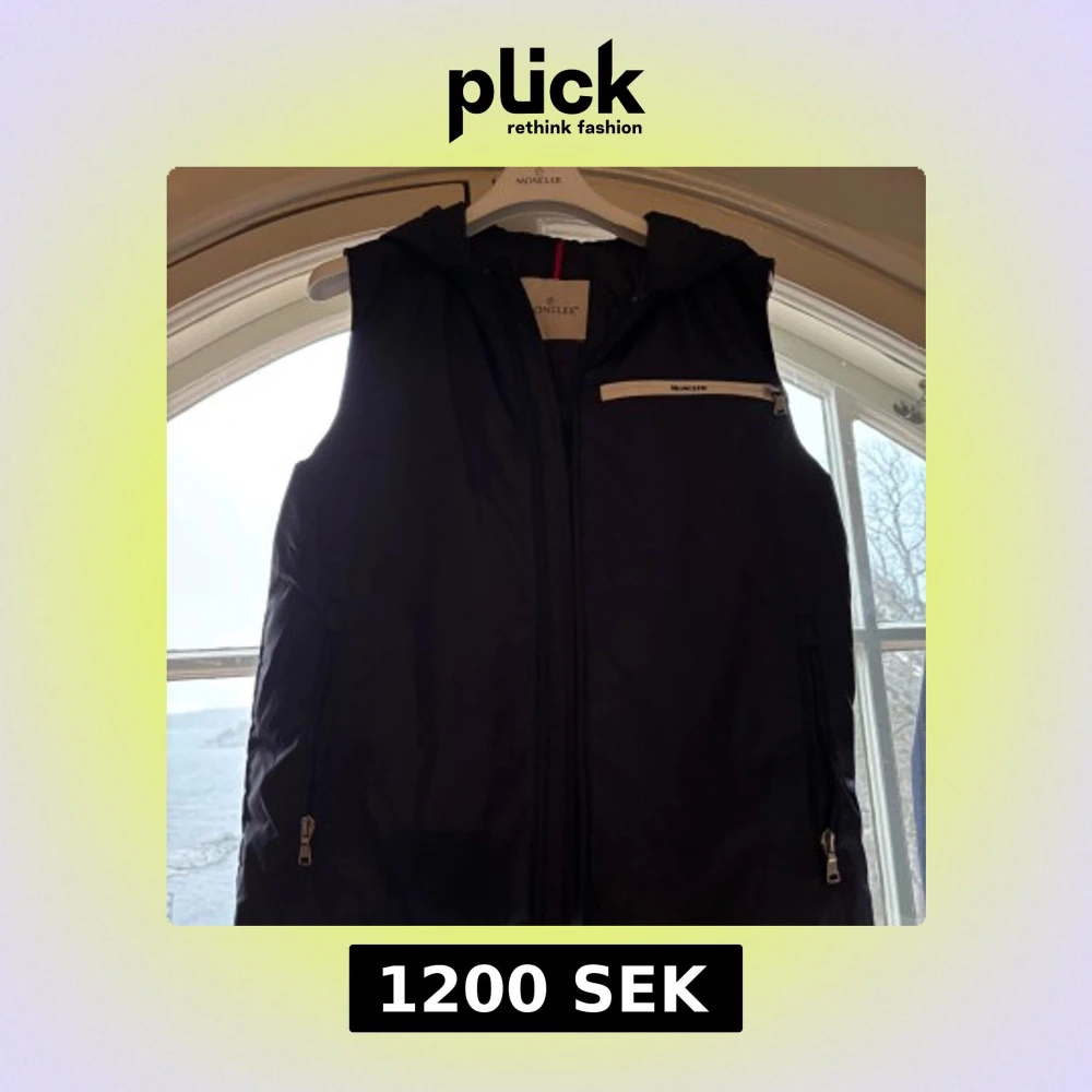 Snygg svart dunväst från Moncler med dragkedja och huva. Västen har praktiska fickor med dragkedjor och en stilren design. Perfekt för kyligare dagar. Den har ett håll i högra fickan, den är storlek 14 år