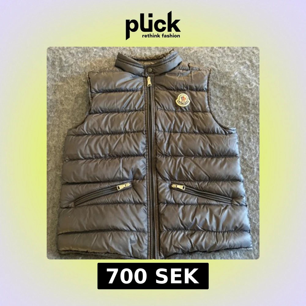 Storlek 12/152 Cm. Snygg svart dunväst från Moncler med dragkedja och två fickor framtill. Västen har en hög krage och passar perfekt till lite kyligare sommar/vår dagar. Jättebra kvalitet, inte några skador eller något liknande.