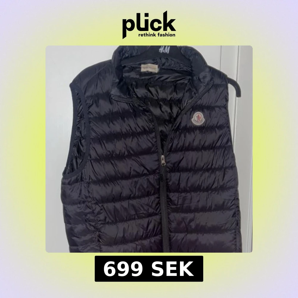 Svart dunväst från Moncler med klassisk quiltad design och hög krage. Västen har dragkedja framtill och ikonisk Moncler-logga på framsidan. Väldigt bra skick. Storlek barnstorlek XXL, passar S-M.