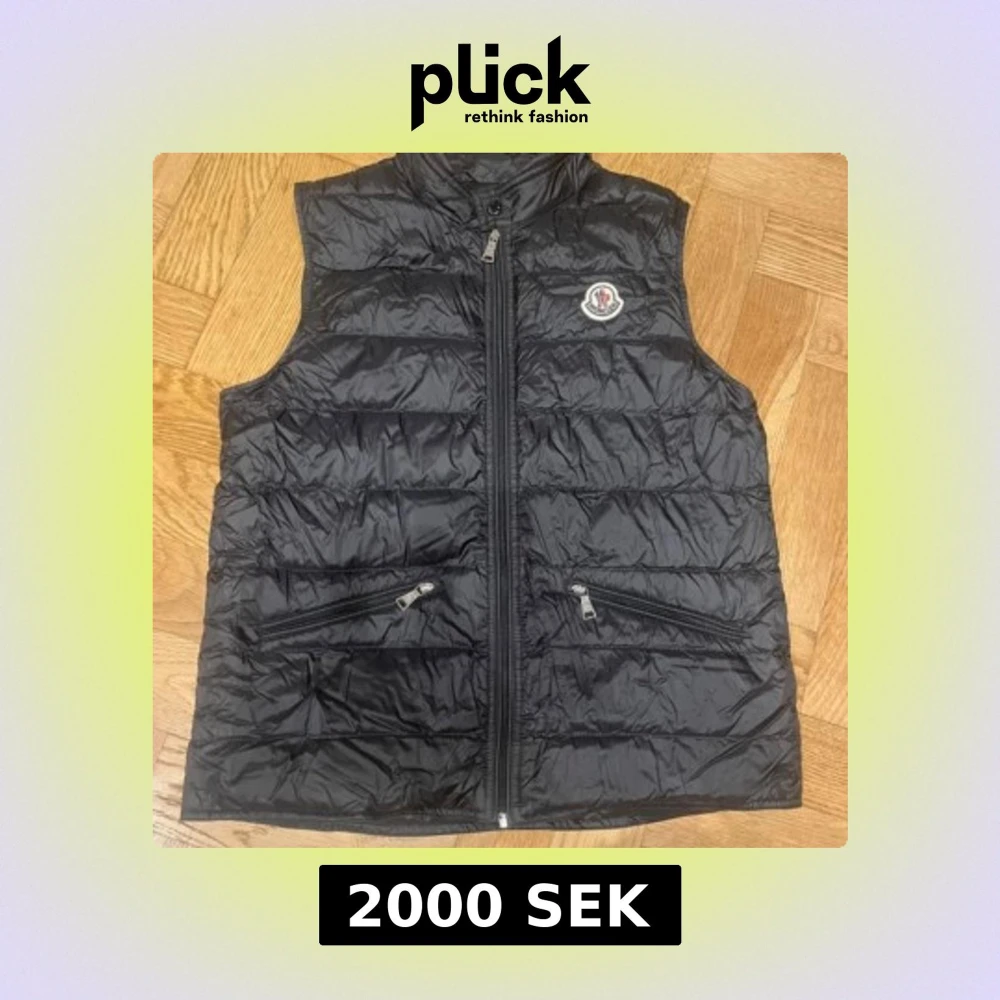 Svart dunväst från Moncler med quiltad design och hög krage. Västen har två snedställda fickor med dragkedja och ett snyggt Moncler-märke på bröstet. Materialet är glansigt och lätt, perfekt för lager-på-lager. Stängs med dragkedja framtill. lite sönder ner till vid dragkedjan men funkar precis som vanligt