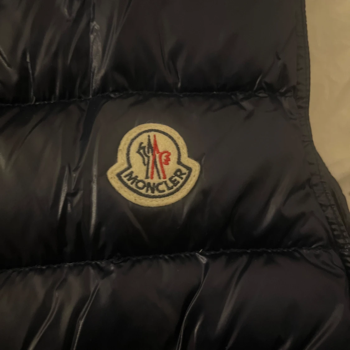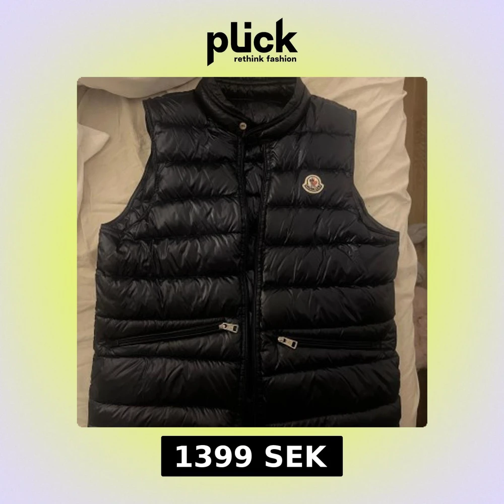 Snygg svart dunväst från Moncler med klassisk quiltad design och hög krage. Västen har två dragkedjefickor framtill och Monclers ikoniska logga på bröstet. Perfekt för lager-på-lager och streetstyle. Dragkedjan är lite svår.
