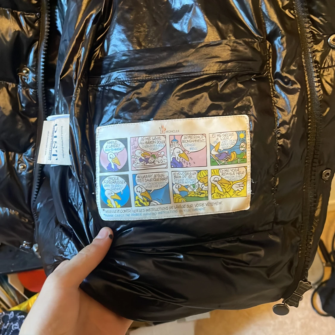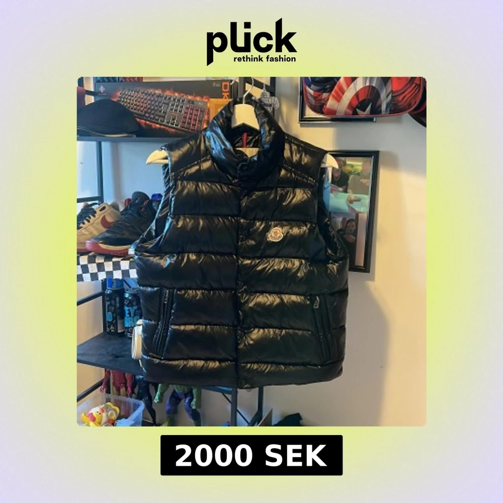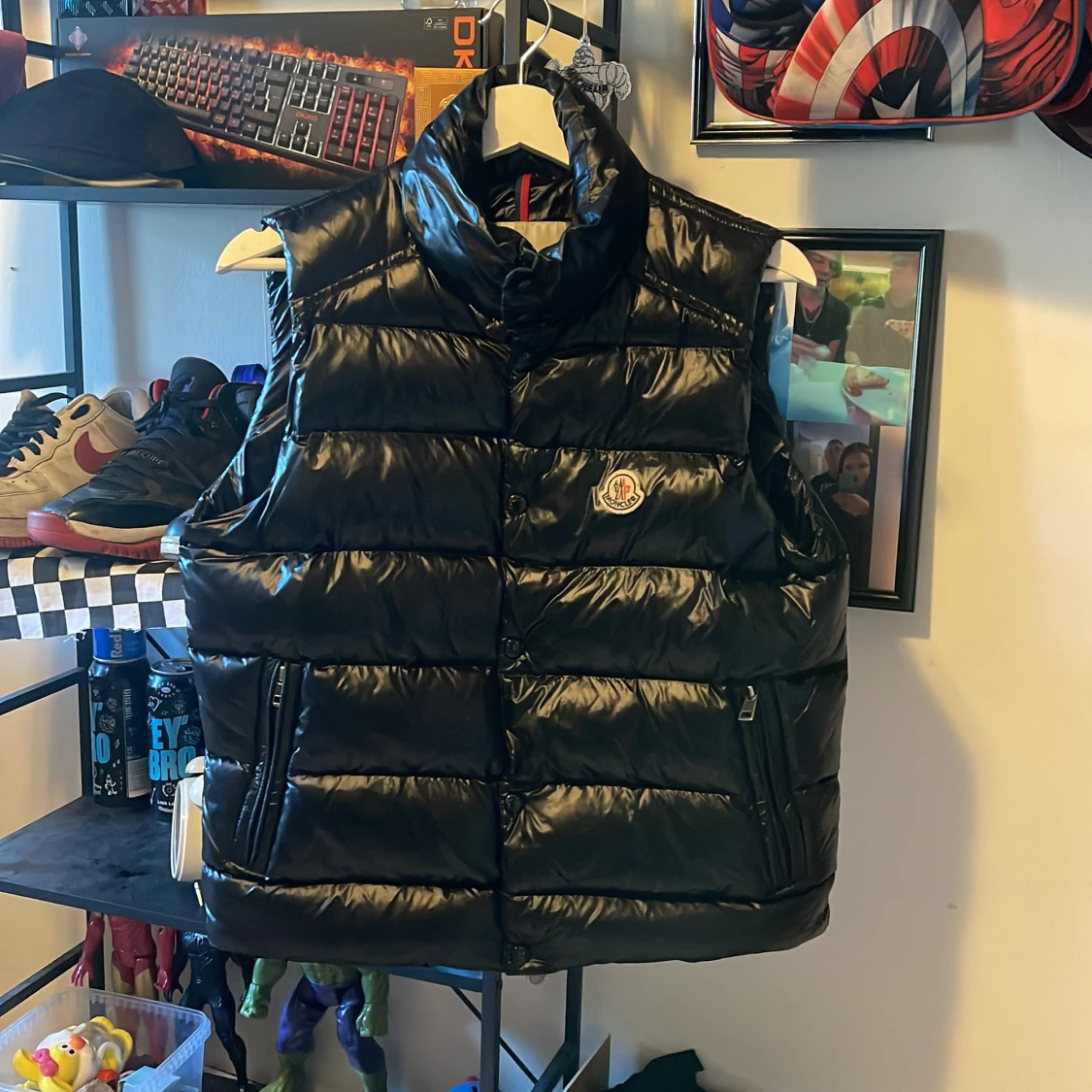 Snygg svart dunväst från Moncler med glansig finish och klassisk logga på bröstet. Västen har hög krage, dragkedja och knappar framtill samt två fickor med dragkedja. Perfekt för lager-på-lager och streetstyle.