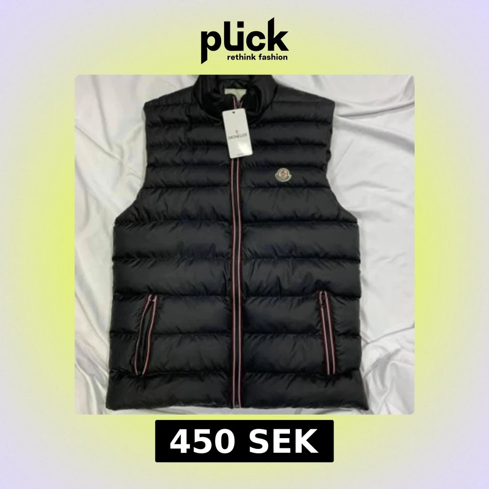 Snygg svart dunväst från Moncler med quiltad design och ståkrage. Västen har dragkedja framtill med rödvita detaljer och två fickor med matchande dragkedjor. Moncler-logga på bröstet ger en exklusiv touch.