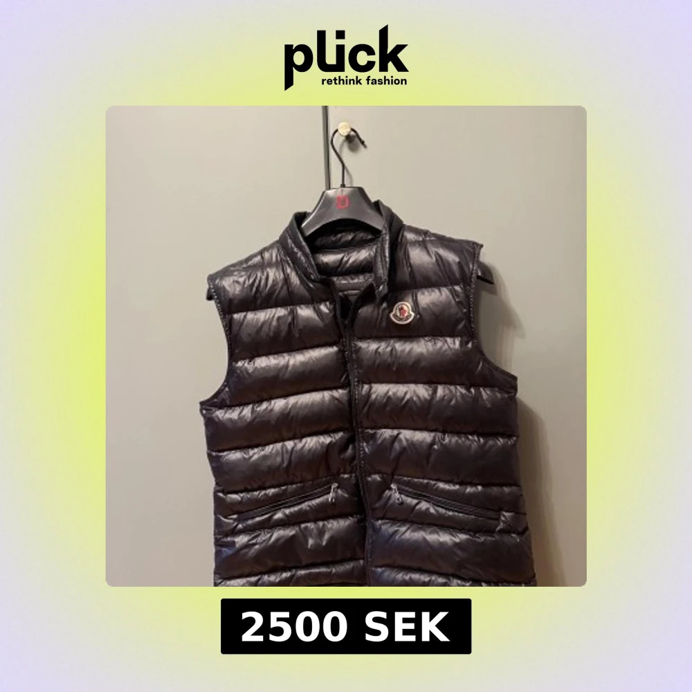 Snygg svart dunväst från Moncler med hög krage och dragkedja framtill.passar 160-170. Dragkedjan är lite trasig men går att dra upp med tålamod(även därför det är bra pris) Västen har två fickor med dragkedja och Moncler-logga på bröstet. Perfekt för sena kvällar på sommaren!🥳🍾frågor eller funderingar hör bara av er!