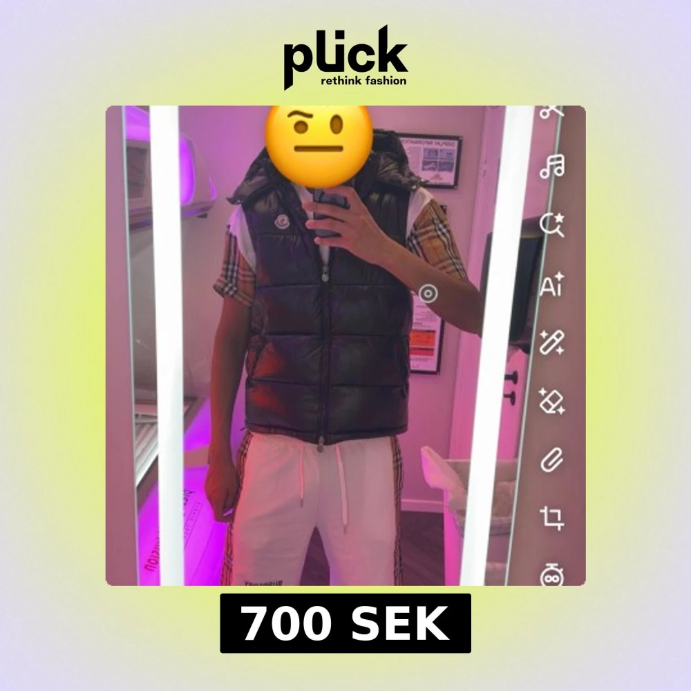Snygg svart dunväst från Moncler med glansig finish och hög krage. Västen har dragkedja framtill och ikonisk Moncler-logga på bröstet. Perfekt att slänga över en t-shirt eller hoodie för en sportig och trendig look. Storlek XL men passar M-L. NFC scan