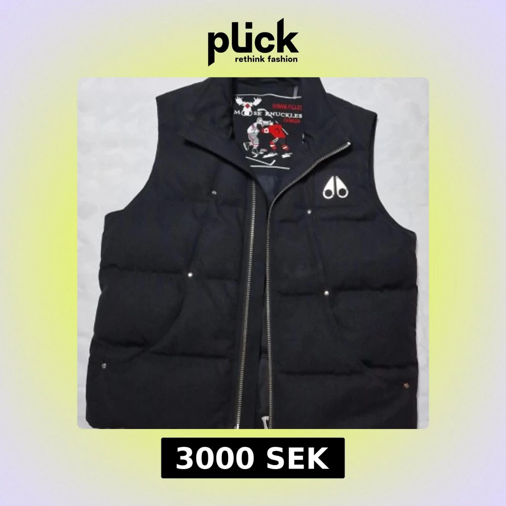 Svart dunväst från Moose Knuckles med silvrig logga på bröstet och grov dragkedja. Västen har quiltad design och innerfoder med broderat hockeymotiv. Perfekt för lager-på-lager och snygg till streetwear. Ny pris ca 7000, mitt pris 3000 och kvitto medföljer :)