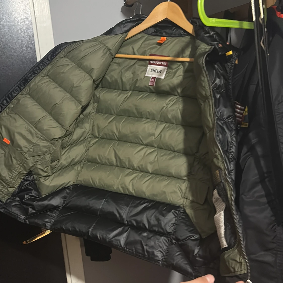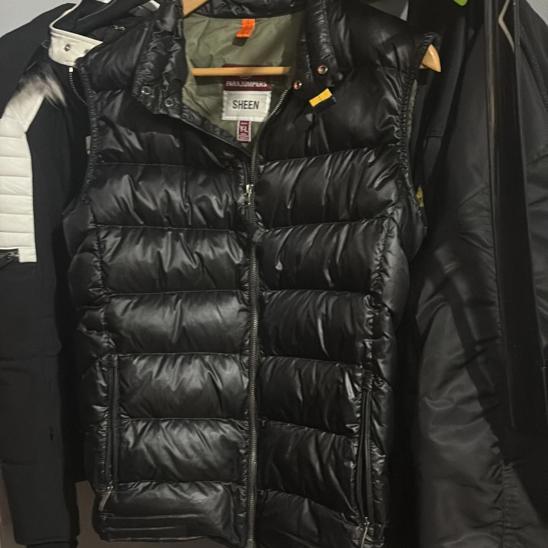 Säljer en svart dunväst från Parajumpers, modell Sheen. Västen har quiltad design, dragkedja framtill och coola detaljer som märkets patch på insidan. Insidan är olivgrön och materialet är glansigt och slitstarkt. Perfekt för lager-på-lager under höst och vinter jacka