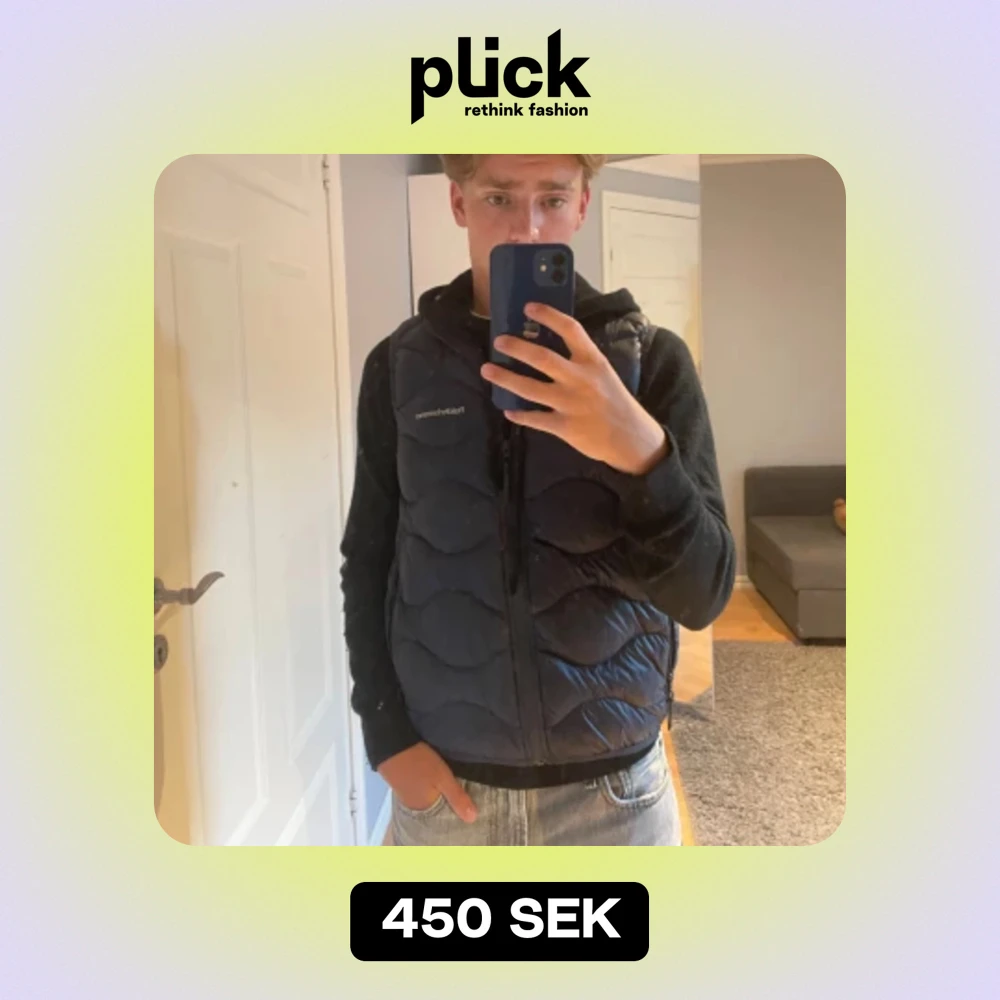 En mörkblå dunväst från Peak Performance med dragkedja framtill. Den har ett litet hål som lappat och syns knappt. Storleken är 160. Ny pris ca 1200 mitt pris 450kr