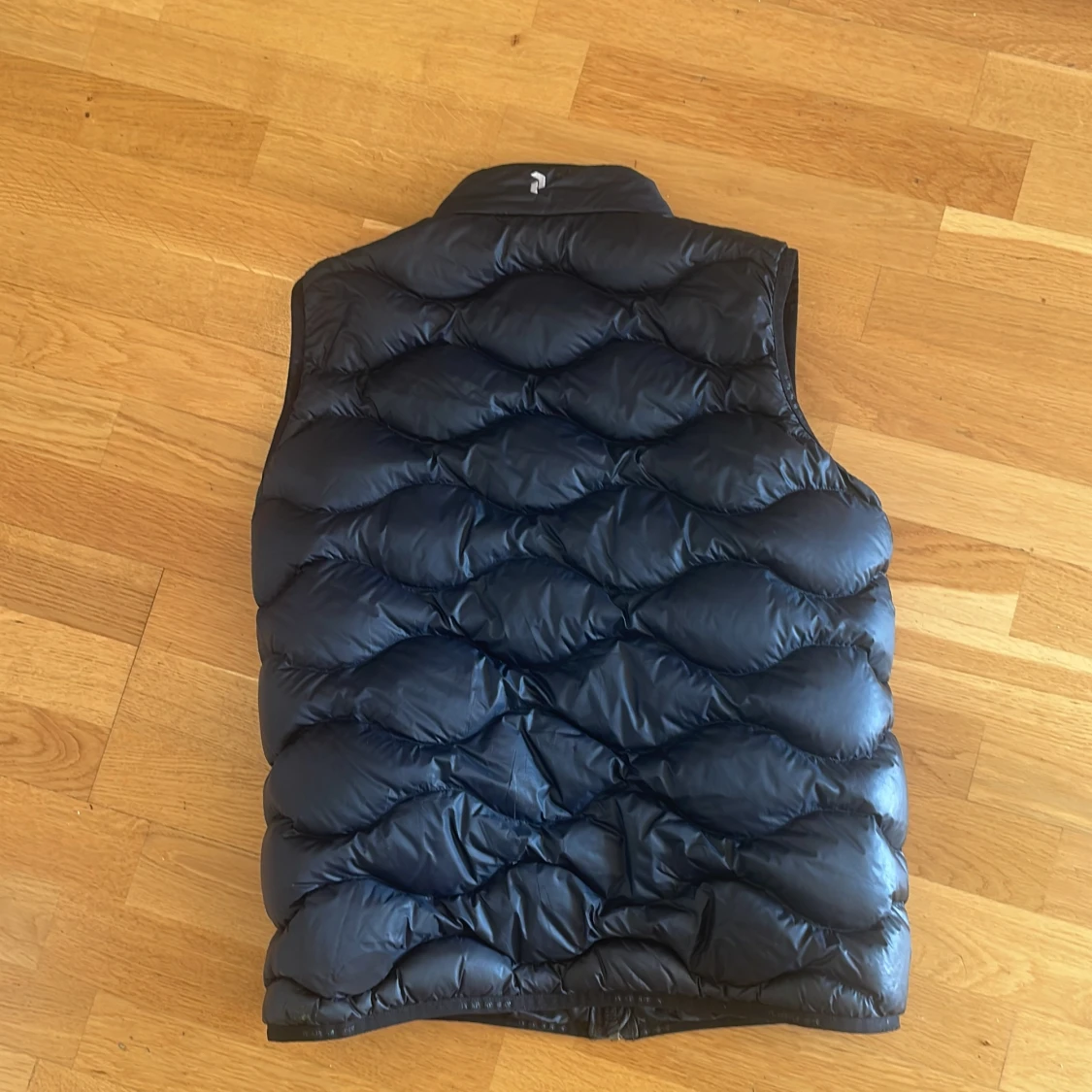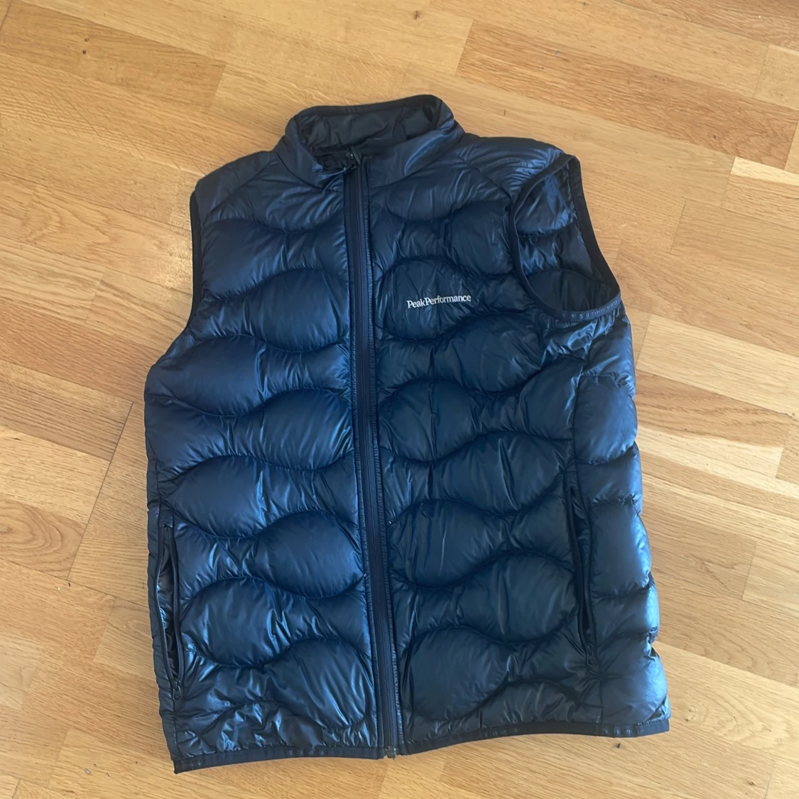 Säljer en svart dunväst från Peak Performance med quiltad design och hög krage. Västen har dragkedja framtill och två sidofickor. Perfekt att slänga över en hoodie för extra värme. Diskret logga på bröstet och stilren look. Fullt äkta, nypris: 2399 kr. Perfekt kap!