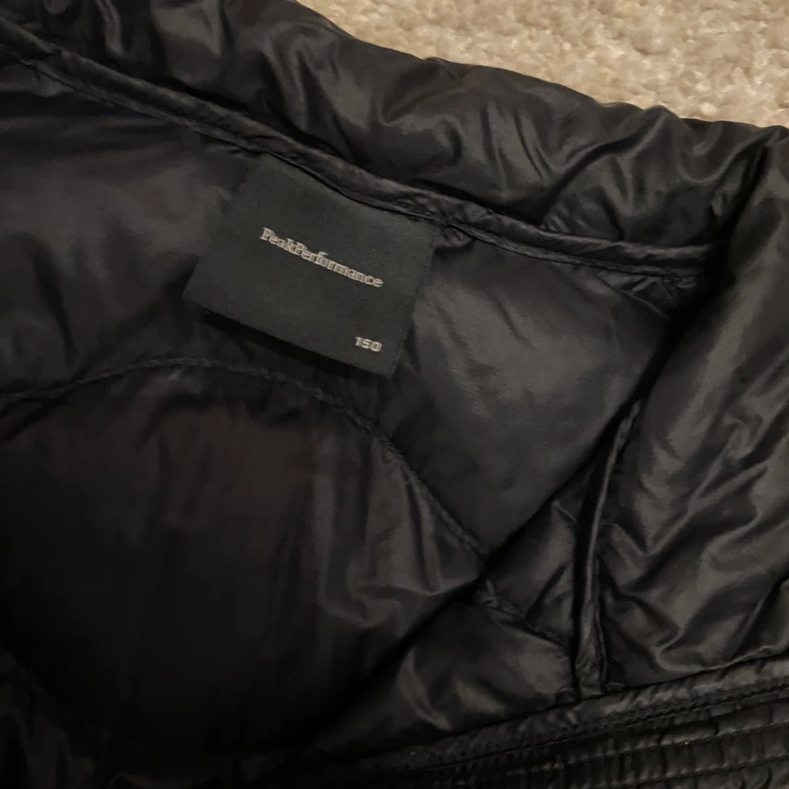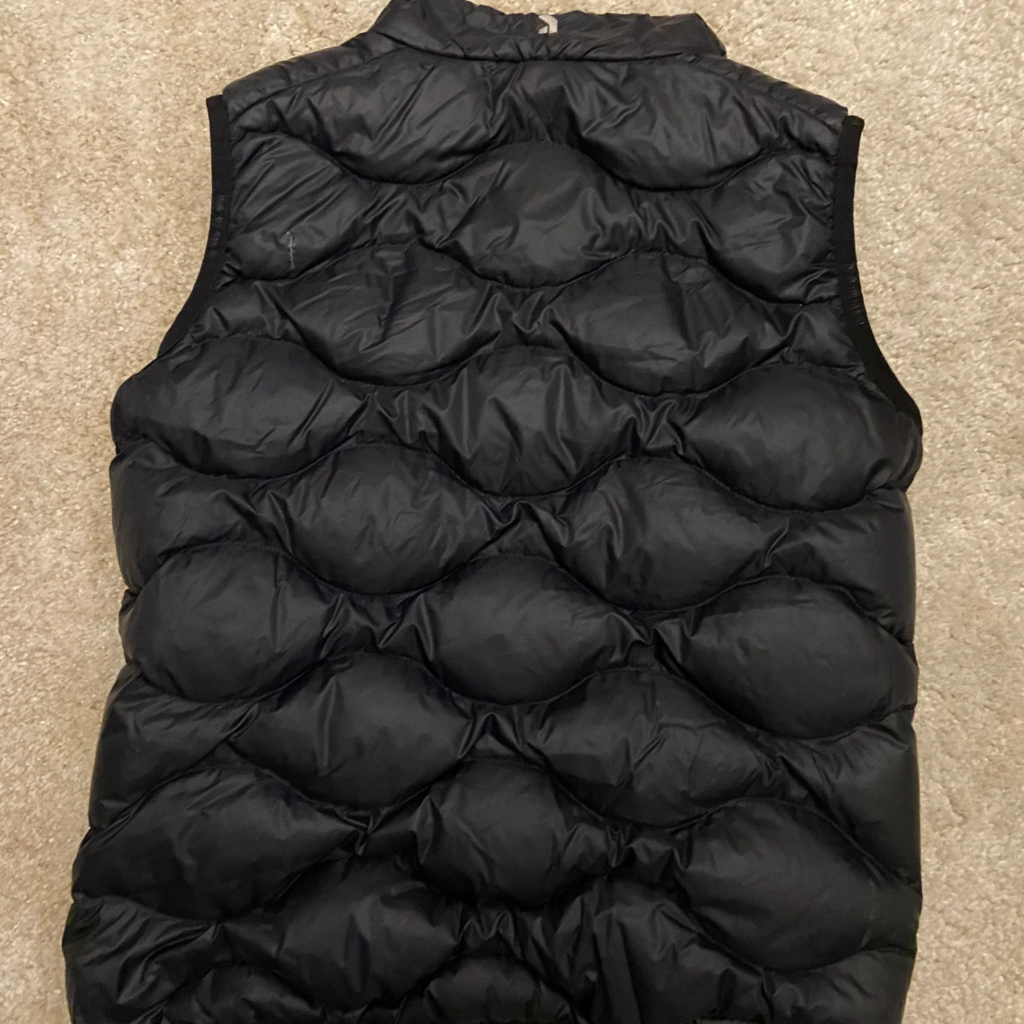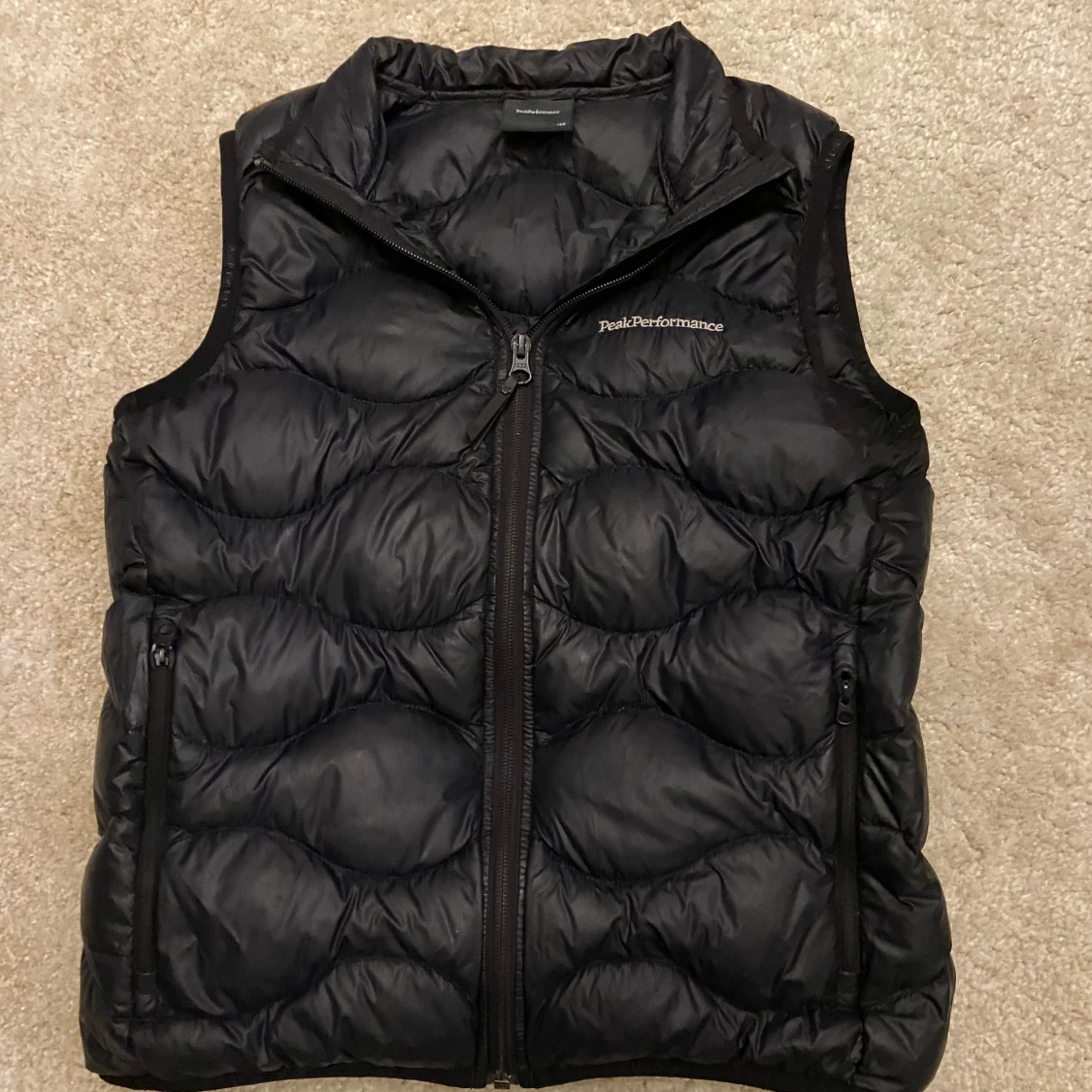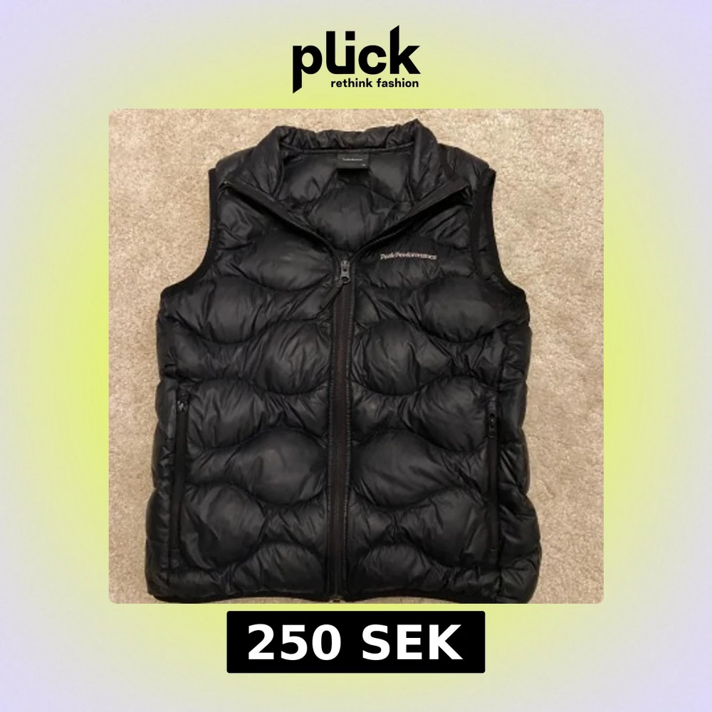 Säljer en svart dunväst från Peak Performance med dragkedja framtill och två fickor med dragkedja. Västen har en quiltad design och hög krage, perfekt för lager-på-lager under kyliga dagar.
