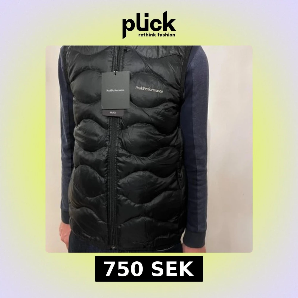 Snygg svart dunväst från Peak Performance med vågformat quiltat mönster och dragkedja framtill. Västen har en stilren look med diskret logga på bröstet och är perfekt att slänga över en hoodie eller tröja för extra värme.