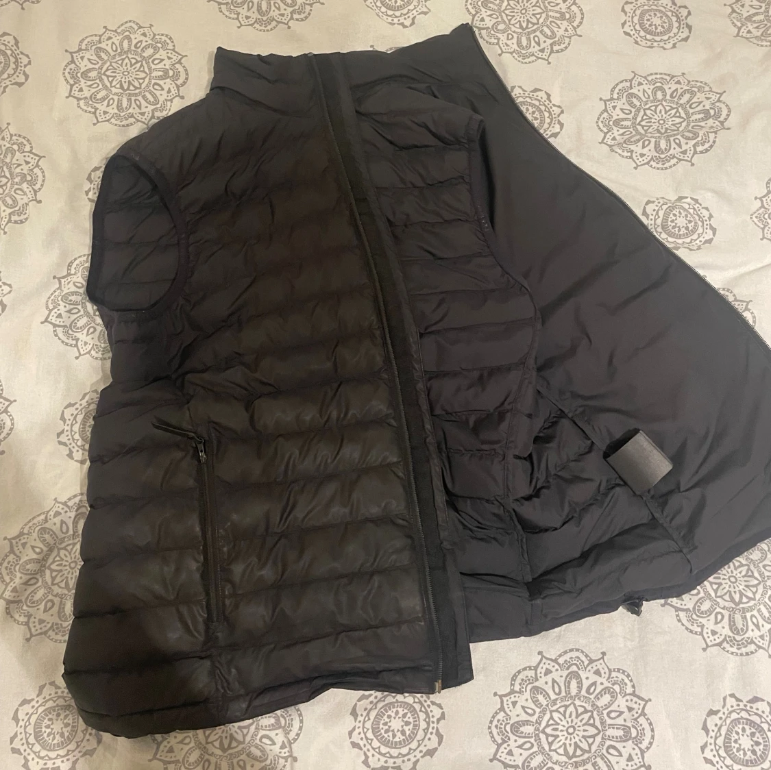 Svart dunväst från Peak Performance med quiltad design och hög krage. Västen har dragkedja framtill, två sidofickor med dragkedja och en bröstficka. Perfekt för lager-på-lager och outdoor-vibe. Storlek m-l