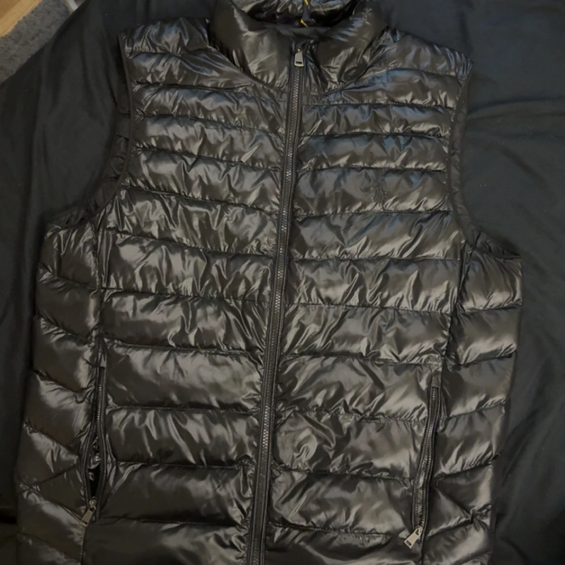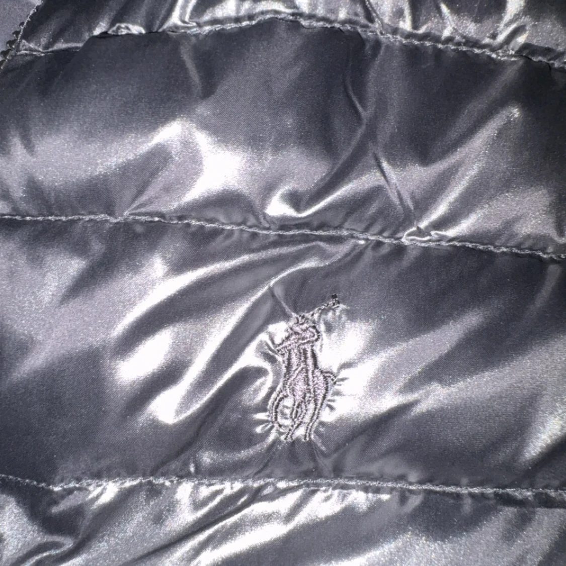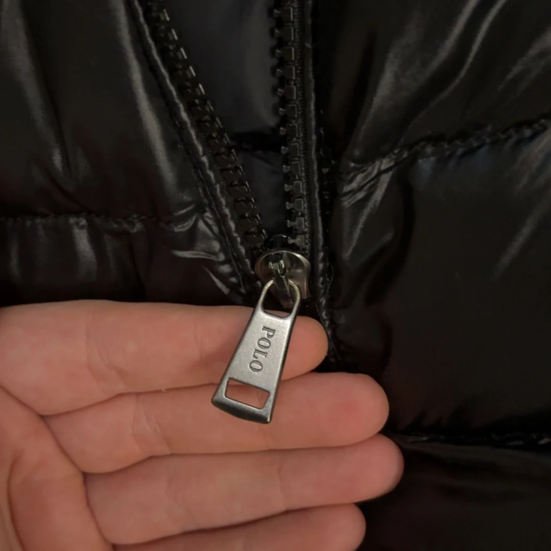 Snygg svart dunväst från Polo Ralph Lauren med quiltad design och hög krage. Västen har två fickor med dragkedja och en tydlig Polo-dragkedja framtill. Perfekt att slänga över en hoodie för en clean look. Hör gärna av dig vid funderingar!🤗