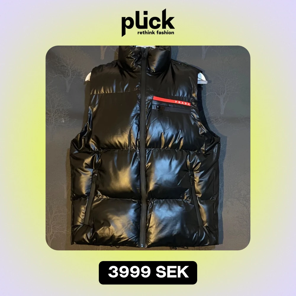 Säljer en snygg svart dunväst från Prada i storlek S. Västen har en dragkedja framtill och en cool röd detalj på bröstfickan. Perfekt för höst och vinter när du vill hålla dig varm och stilren. Passar både till vardags och festliga tillfällen.
